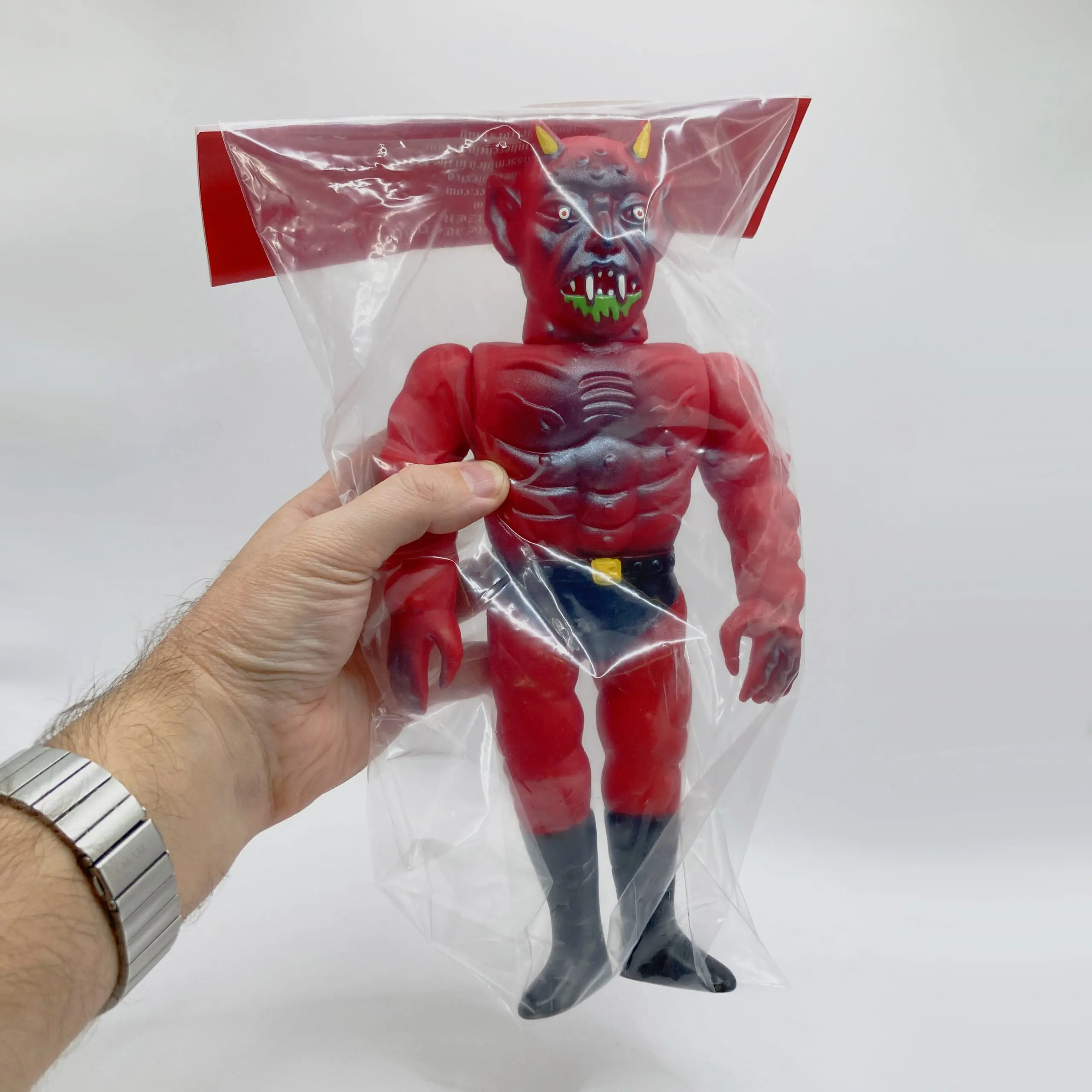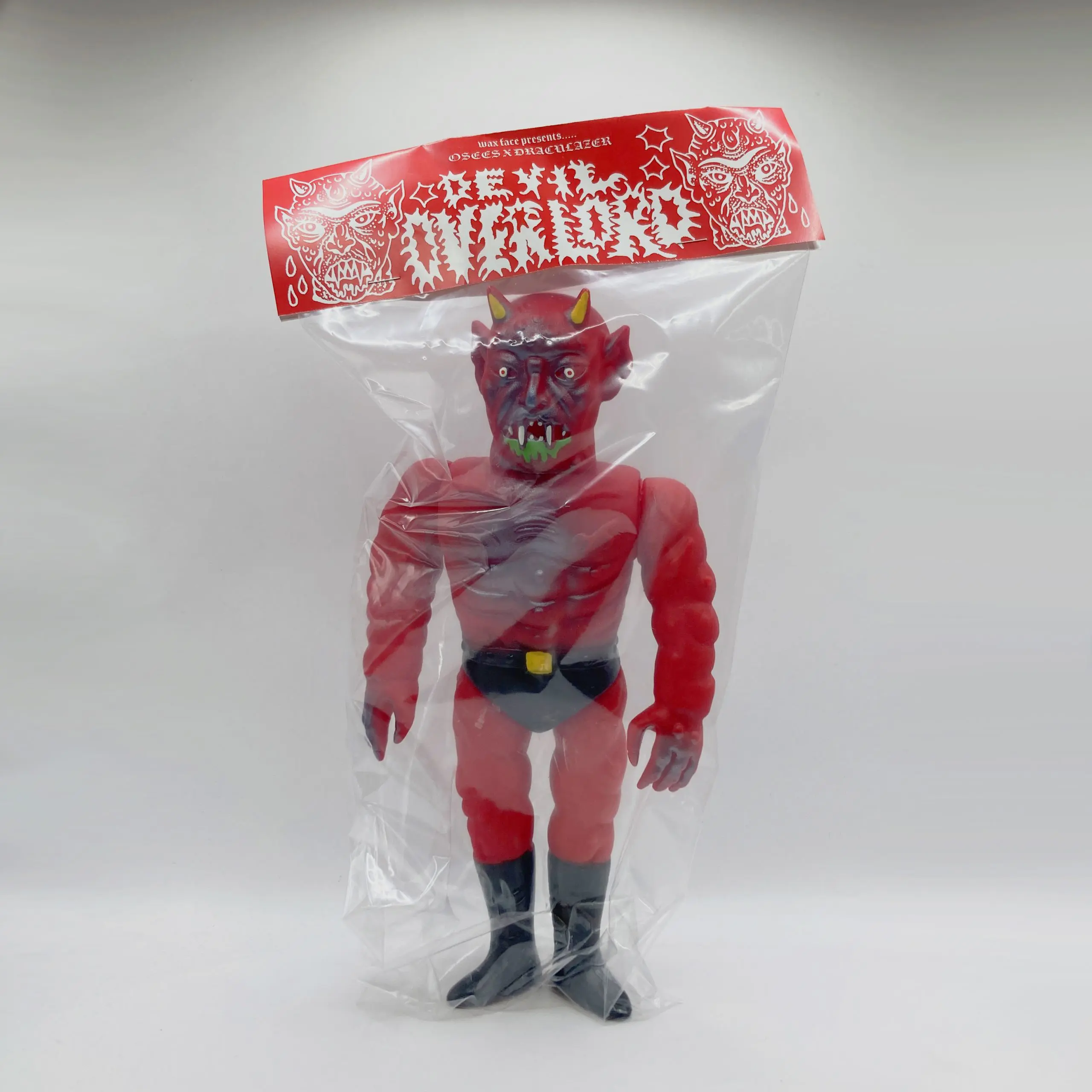 Devil Overlord es una de las piezas más emblemáticas del universo oscuro de Draculazer, artista y productor de sofubi originario de México. Esta imponente figura, de 30 cm de altura, combina la tradición del soft vinyl japonés con una estética ferozmente personal: un demonio monumental, cargado de color y de energía caótica.