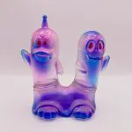 La pieza “Doble Obake no Q” de Frank Mysterio es una de sus obras más distintivas dentro del mundo del sofubi. Su nombre hace referencia directa al personaje clásico japonés Obake no Q-tarō (Q-chan), un fantasma entrañable creado por Fujiko Fujio, pero Frank lo reinterpreta desde su estética muy personal: una mezcla de lo tierno y lo monstruoso, con guiños al folklore japonés, la cultura popular mexicana y el lowbrow art.