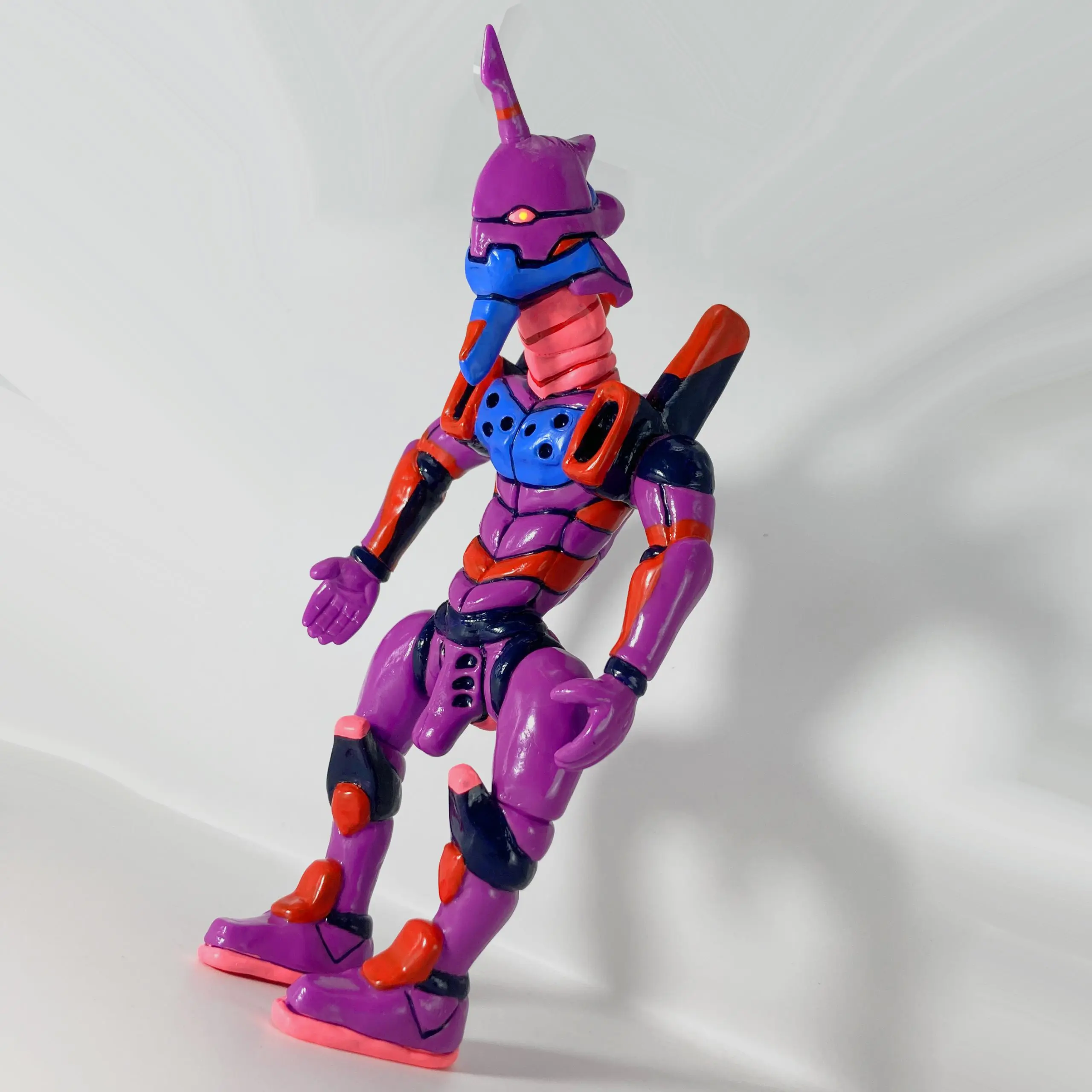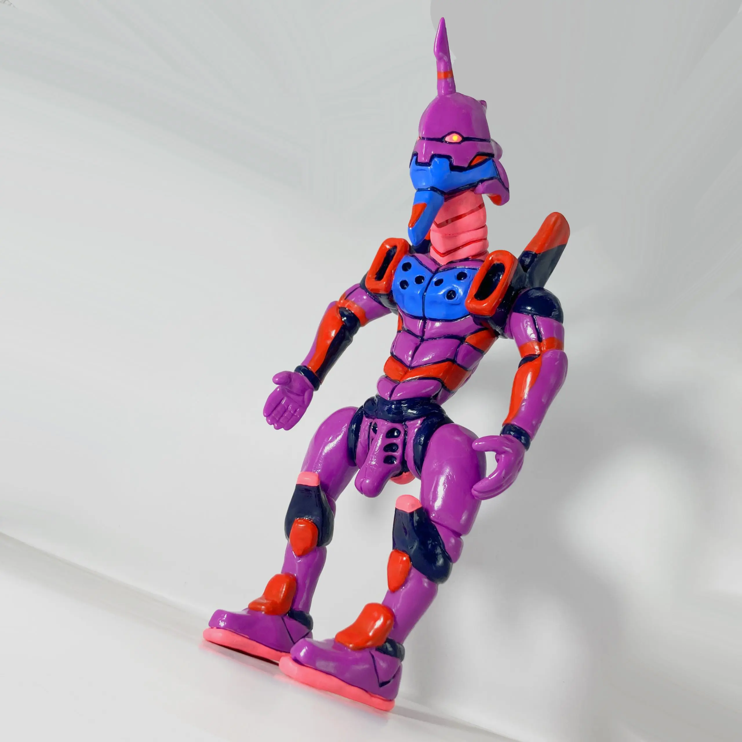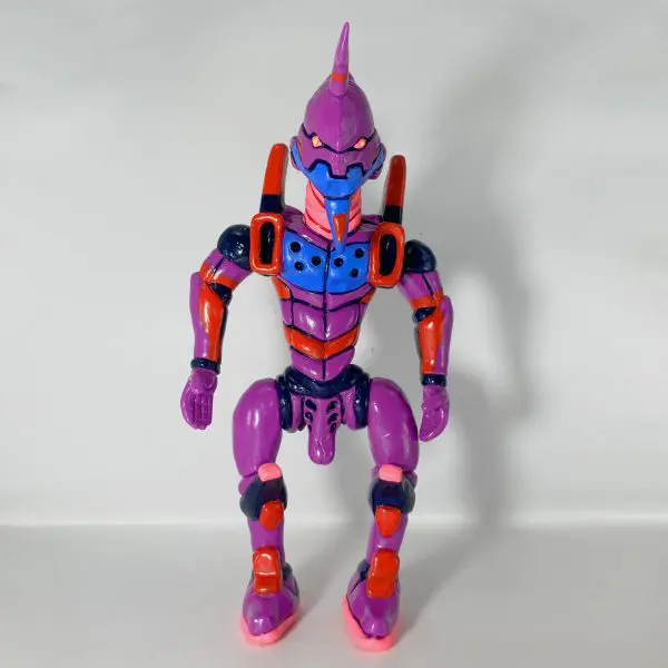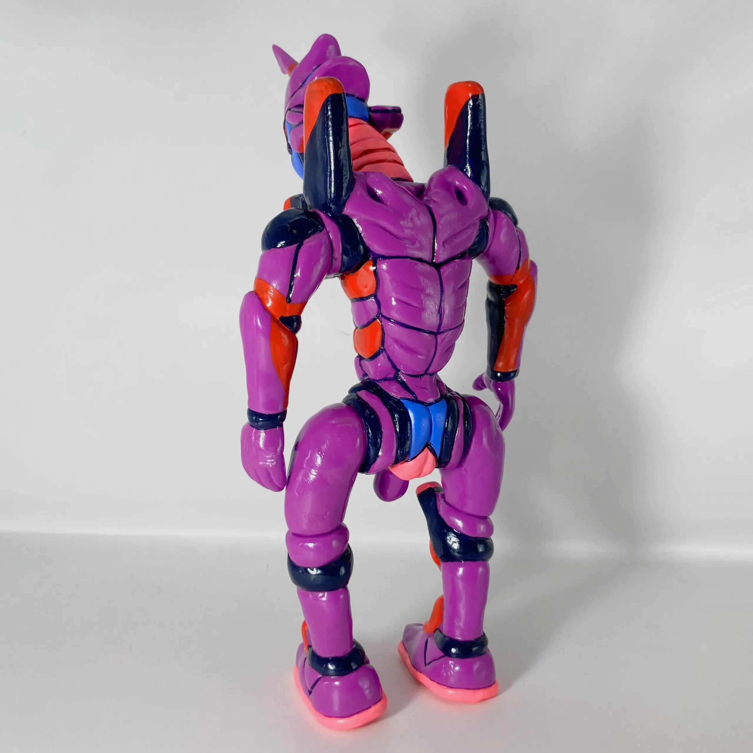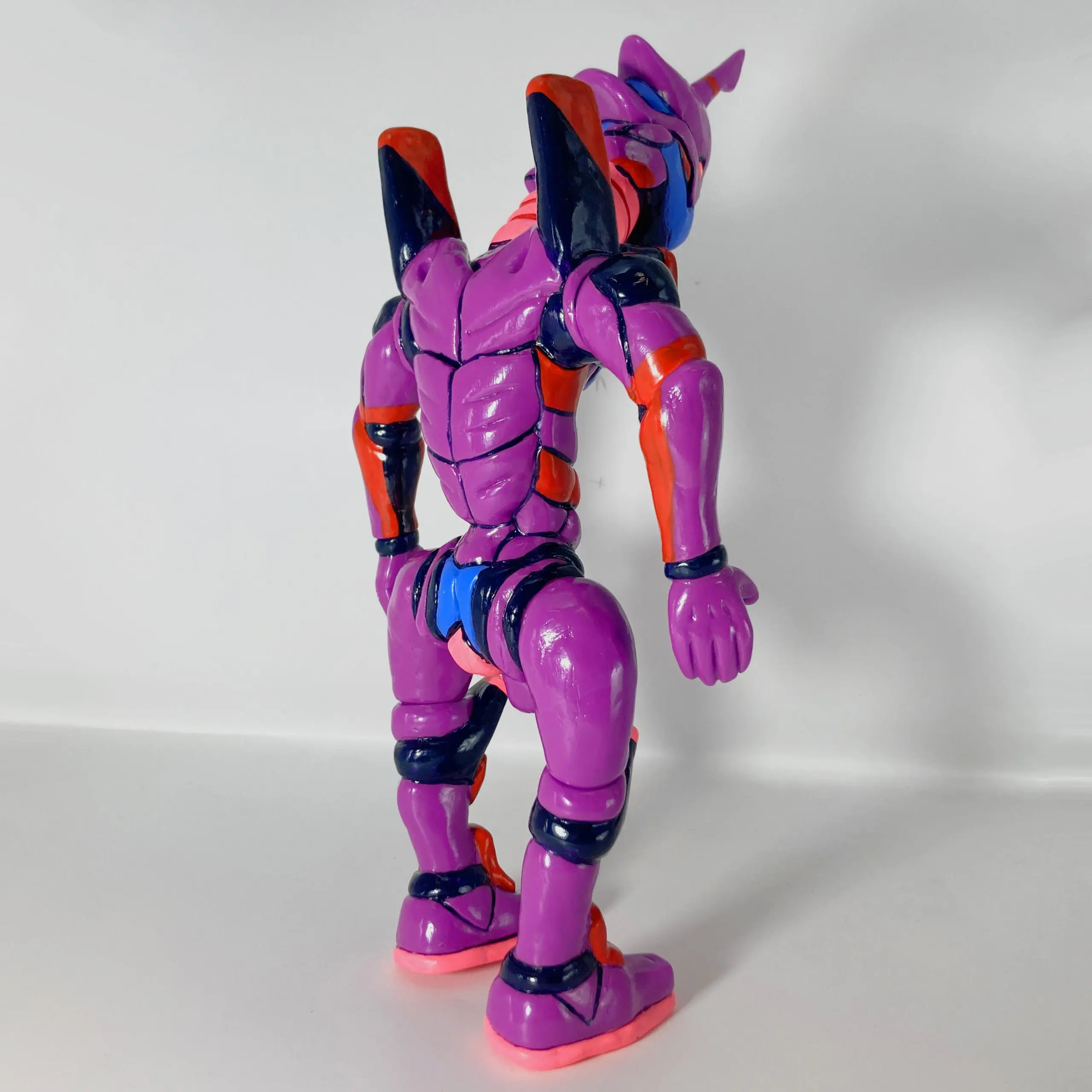El color púrpura característico se mantiene, pero con acabados suaves, pinceladas irregulares y texturas que resaltan el material blando del sofubi, haciendo que parezca más carne mutante que armadura metálica.