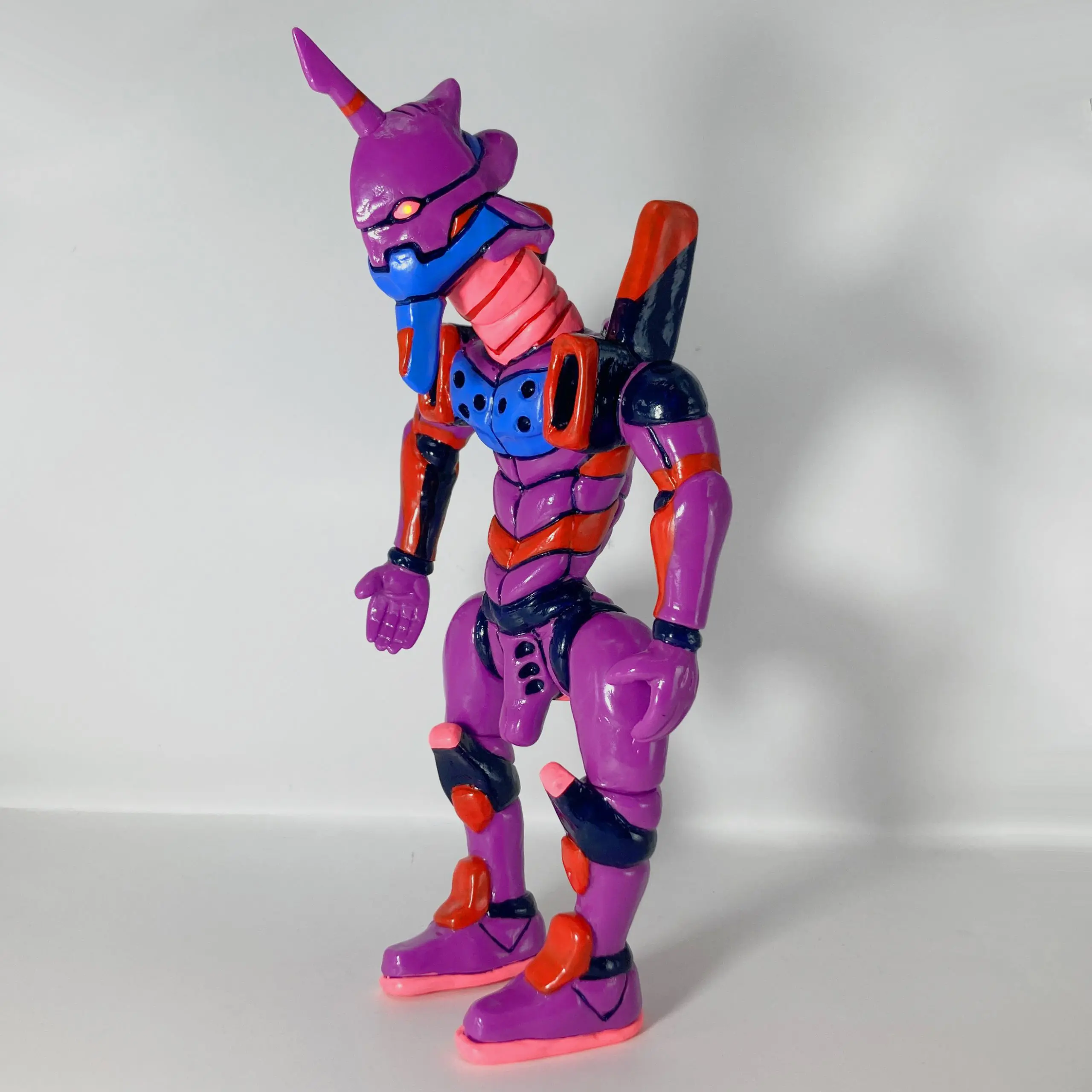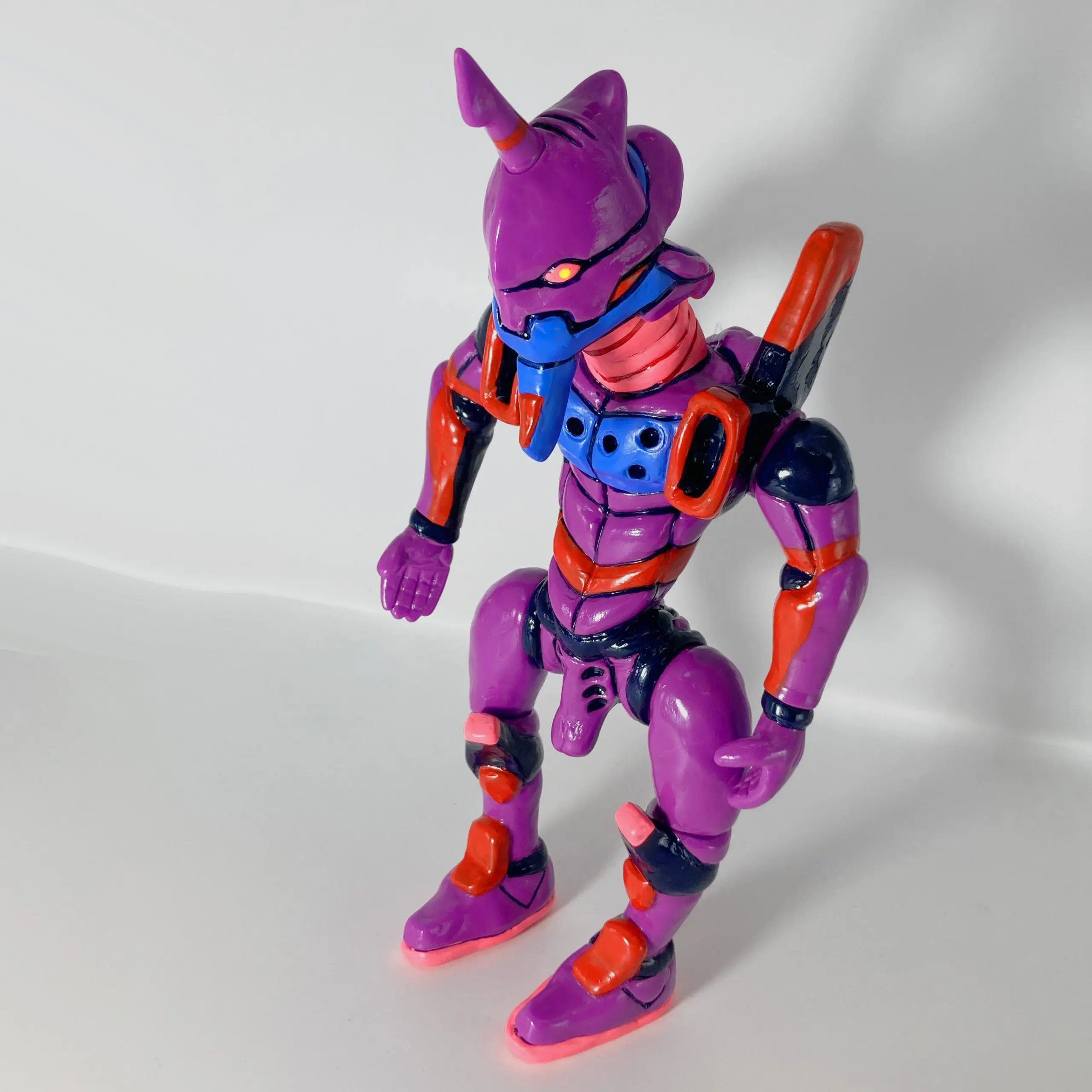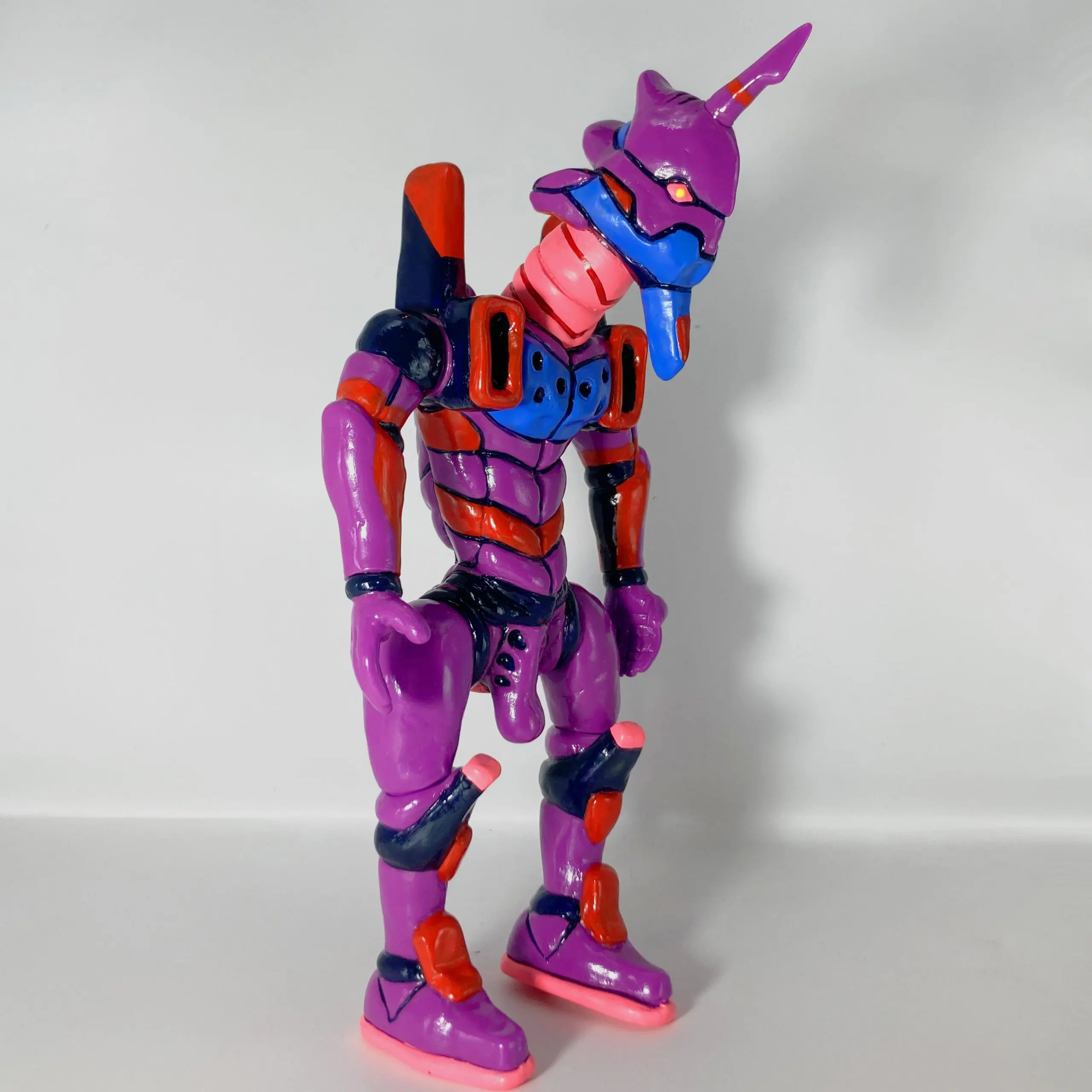 La pieza EVA-01 de Yukinori Dehara es una de las reinterpretaciones más extrañas y cautivadoras que ha hecho el artista de un icono del anime como el Evangelion Unit-01. Lanzada en ediciones ultra-limitadas (principalmente a través de colaboraciones con Kaiyodo y Kisoengai, como parte del proyecto “Evangelion Nendo-ka Keikaku” o ediciones de artista en 2020-2021), esta figura sofubi transforma al mecha berserker por excelencia en algo orgánico, deformado y casi caricaturesco, fiel al estilo visceral y grotesco de Dehara.