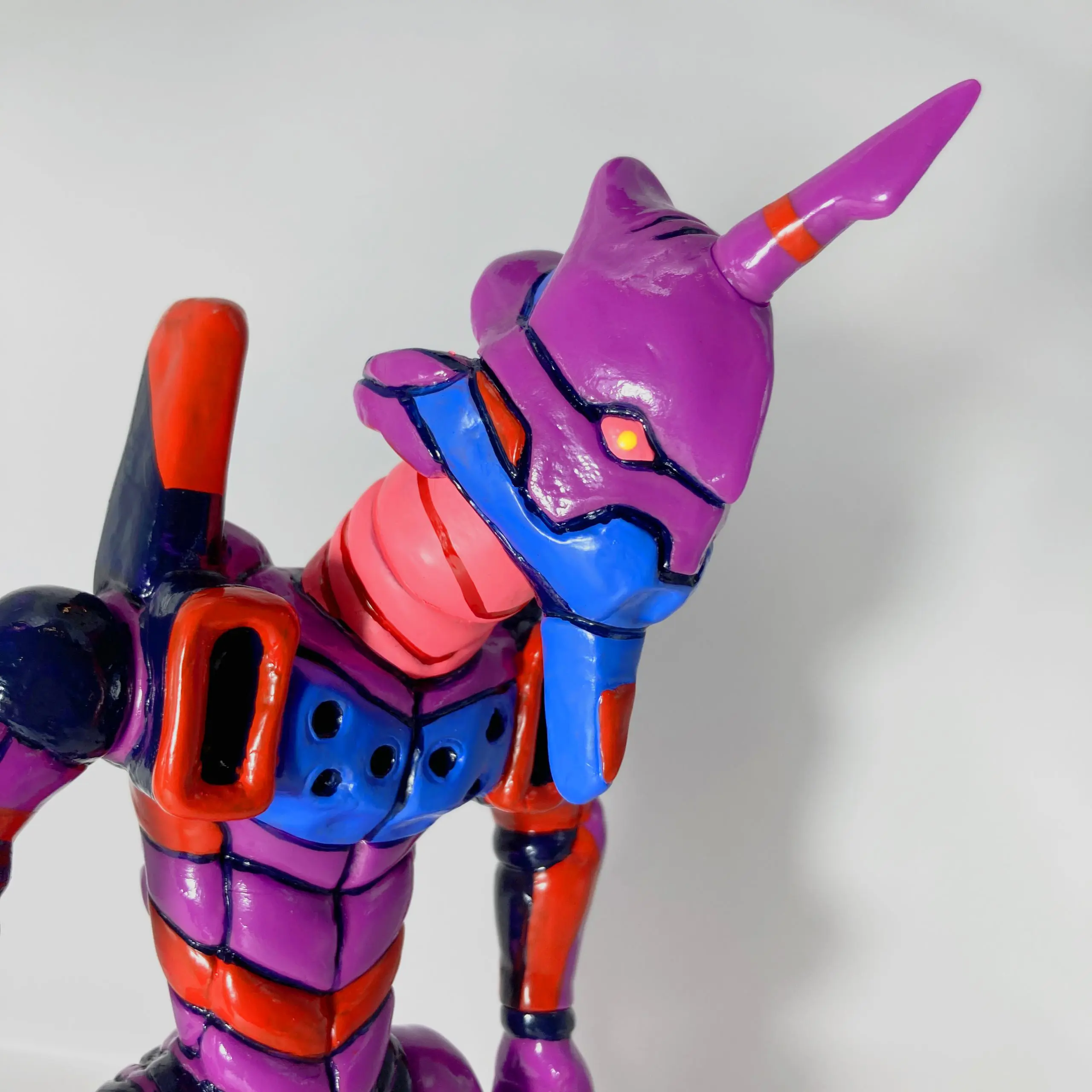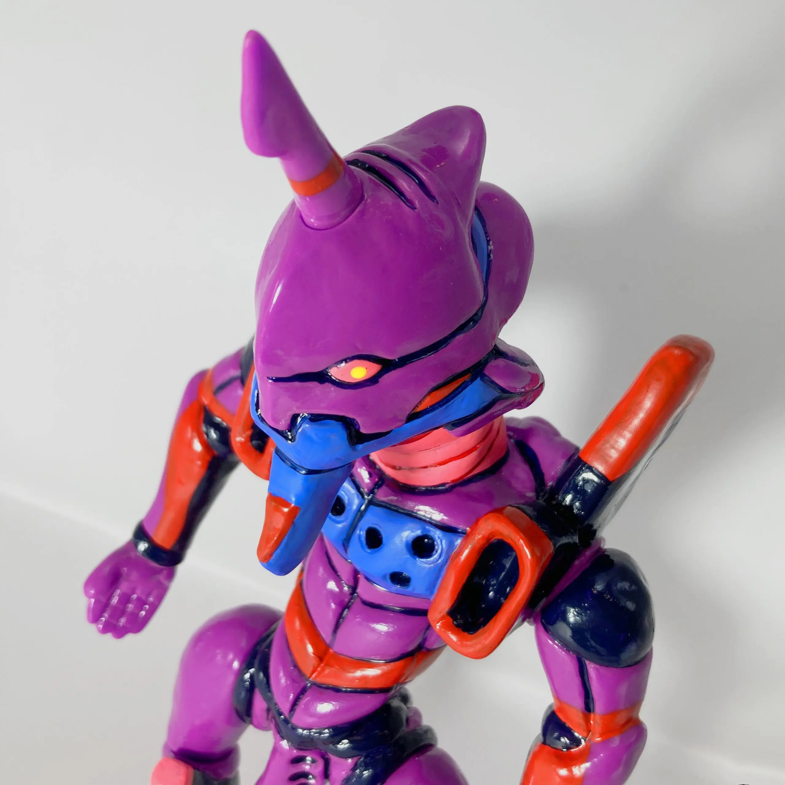 A diferencia de las versiones estándar —esbeltas, angulosas y mecánicas—, la EVA-01 de Dehara adquiere proporciones exageradas y antropomórficas: una cabeza desproporcionadamente grande y redondeada, con ojos que parecen más expresivos y “humanos”
