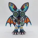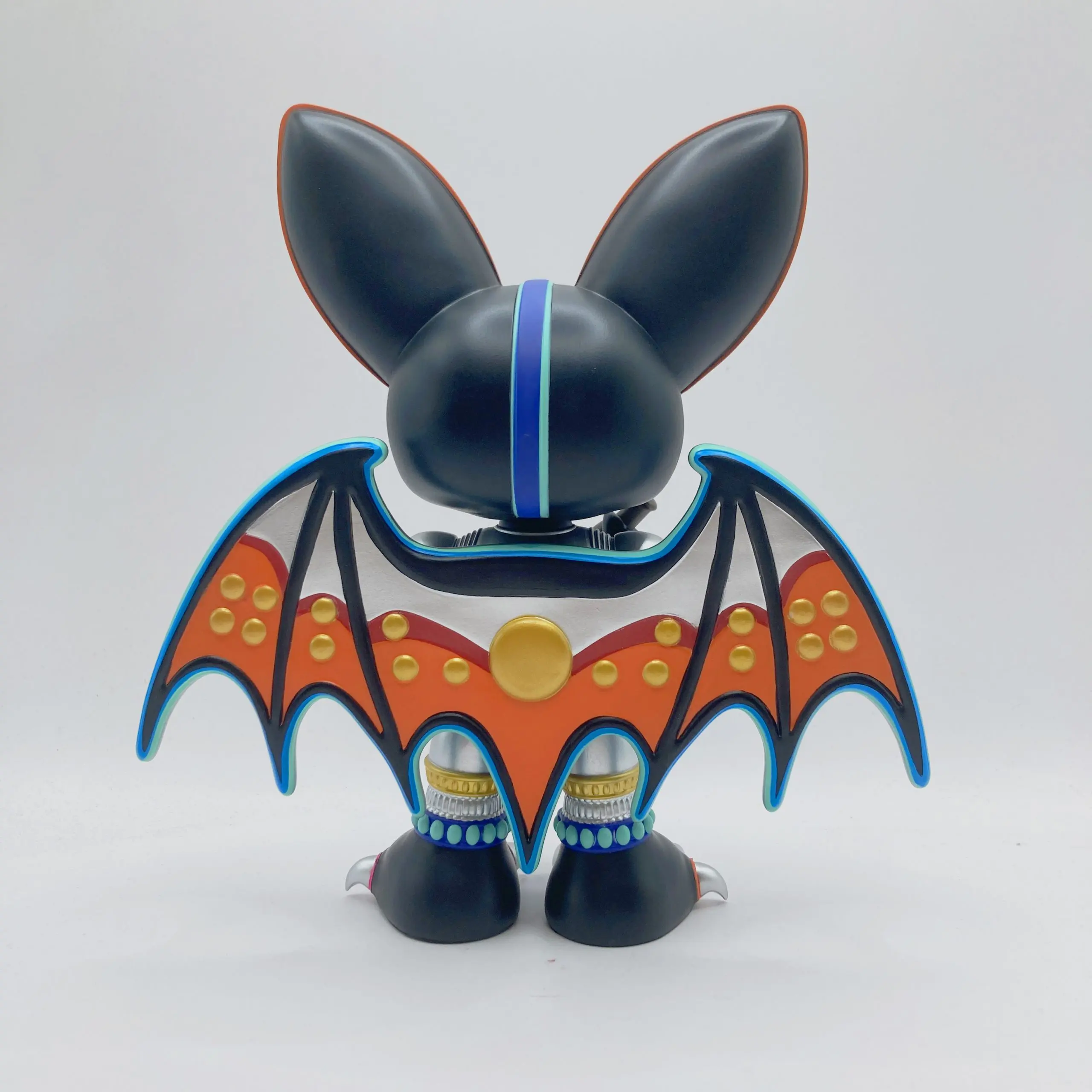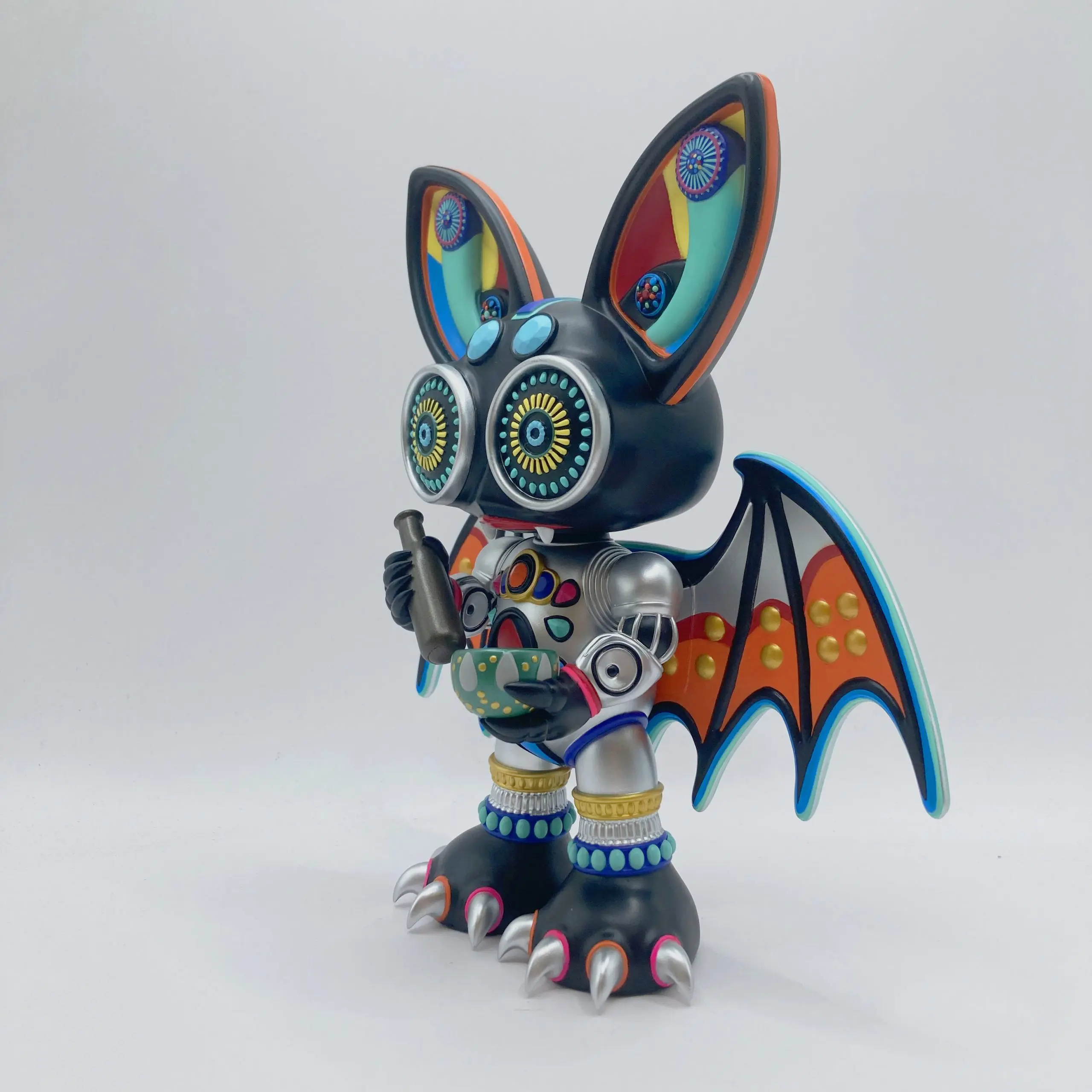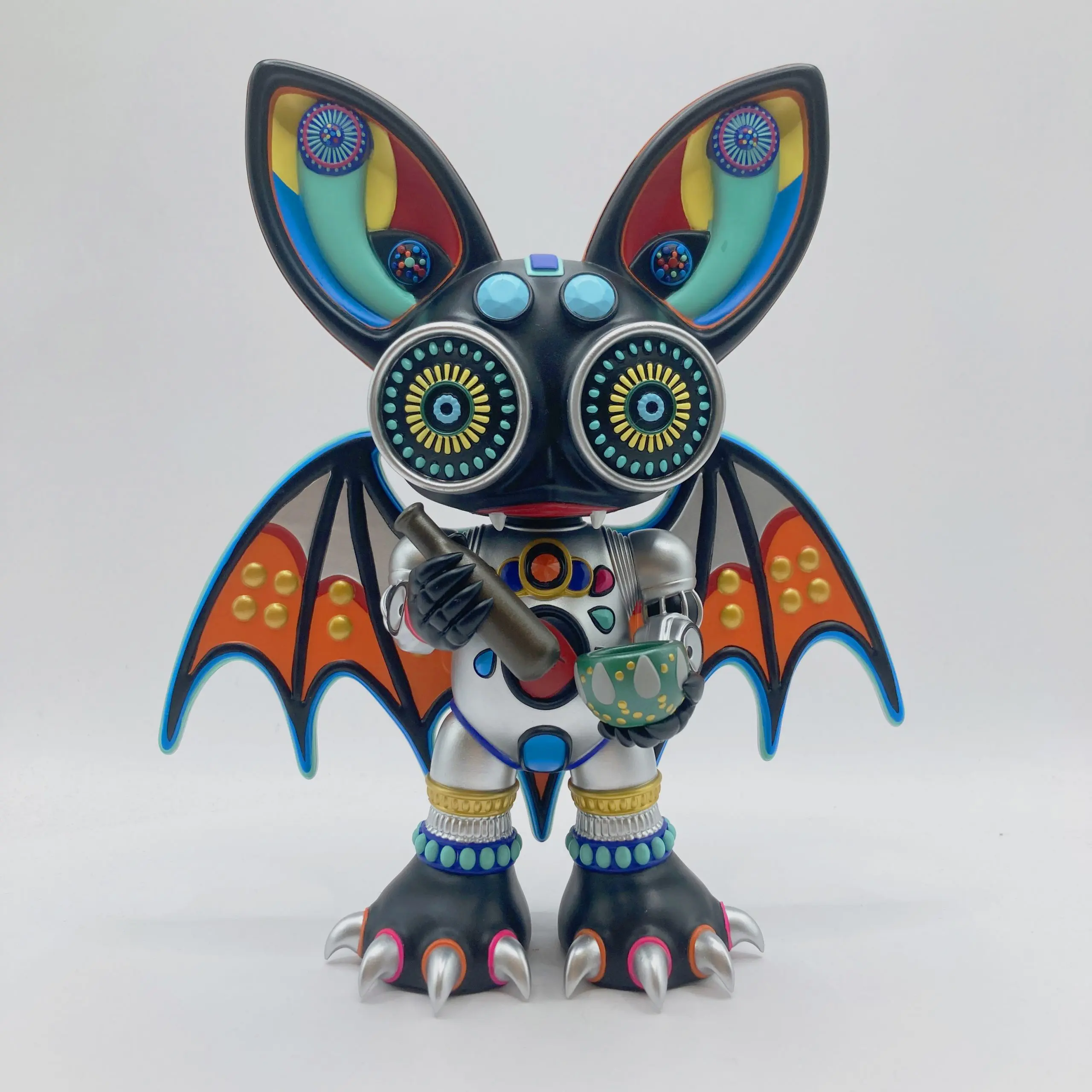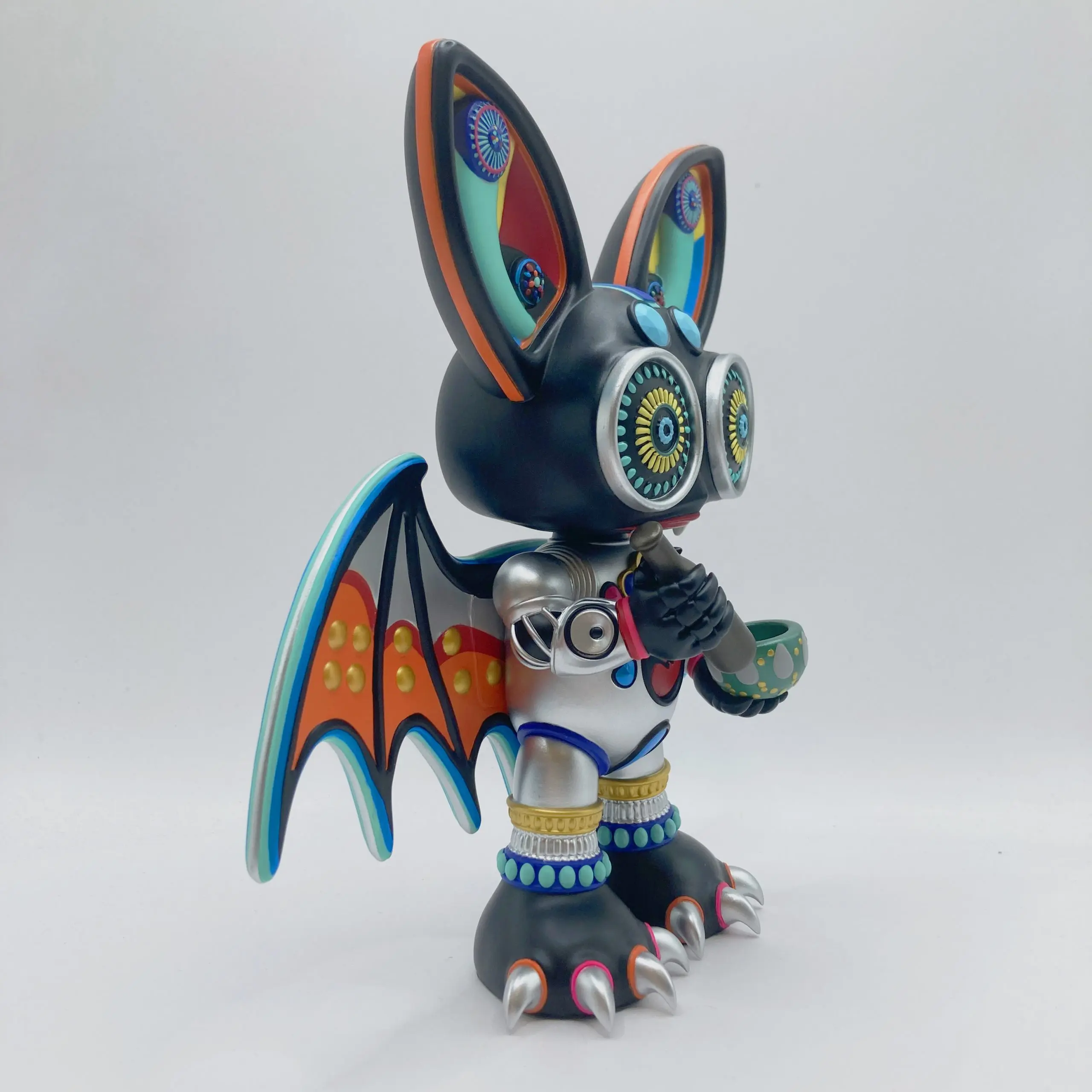 Su diseño combina texturas mecánicas con formas orgánicas, ojos caleidoscópicos que parecen mirar a través del espacio, y una armadura plateada que refleja luces como un fragmento de espejo roto. KaleidoBat encarna la dualidad central del arte juguete contemporáneo: lo infantil y lo místico, lo industrial y lo espiritual.