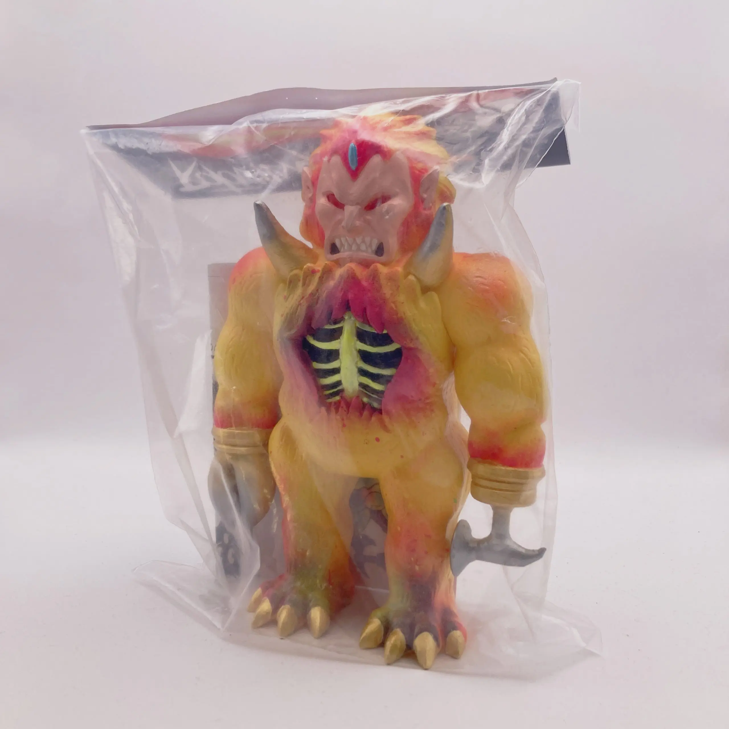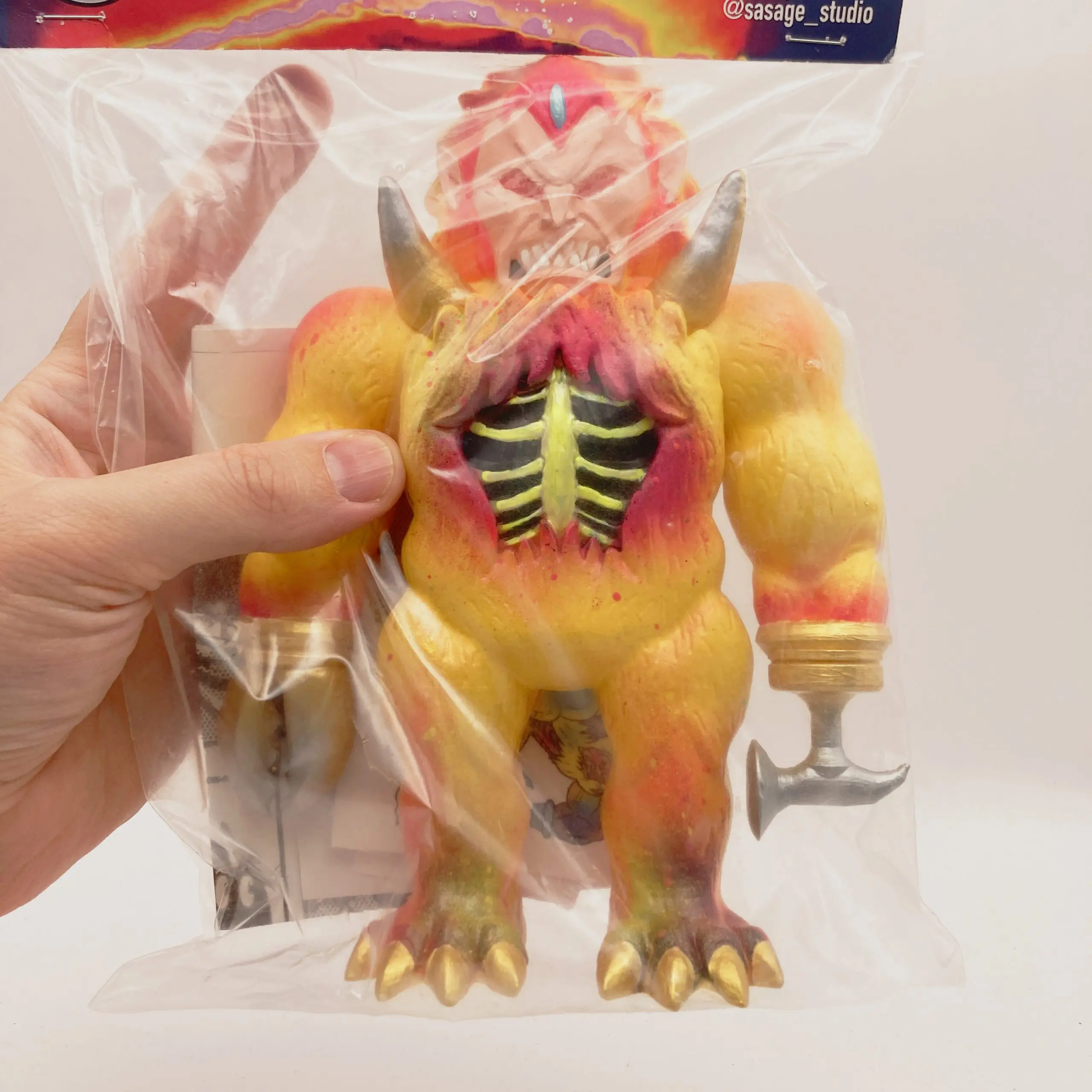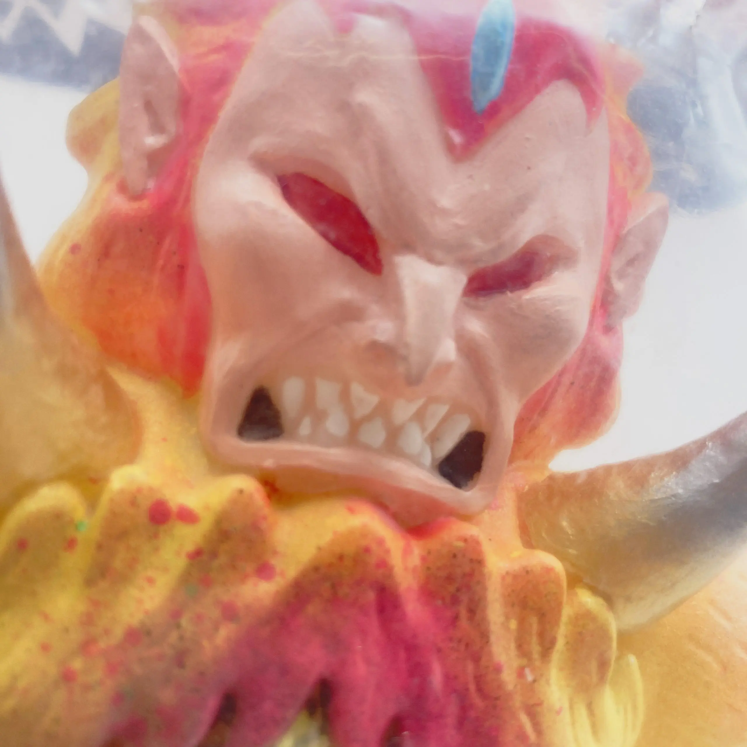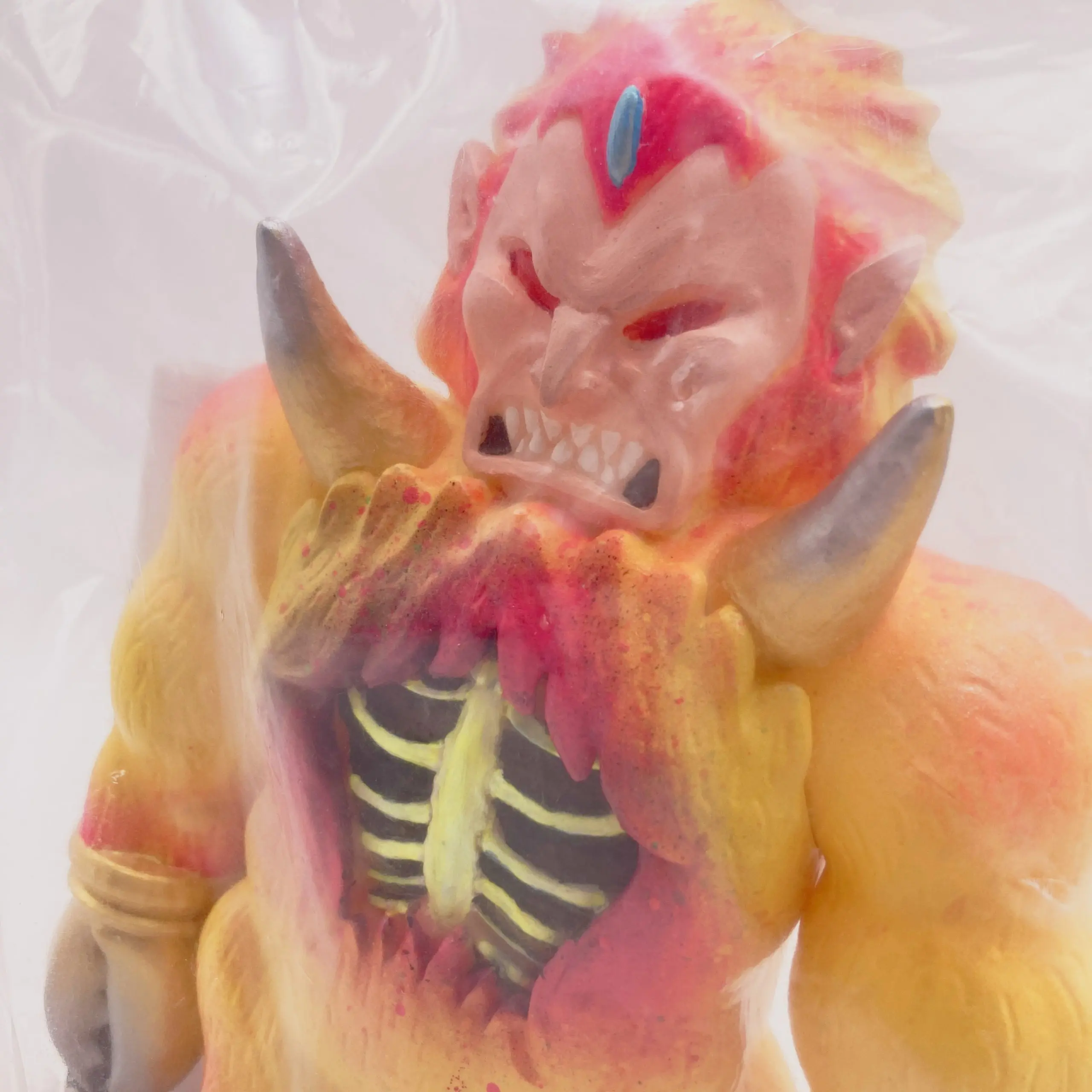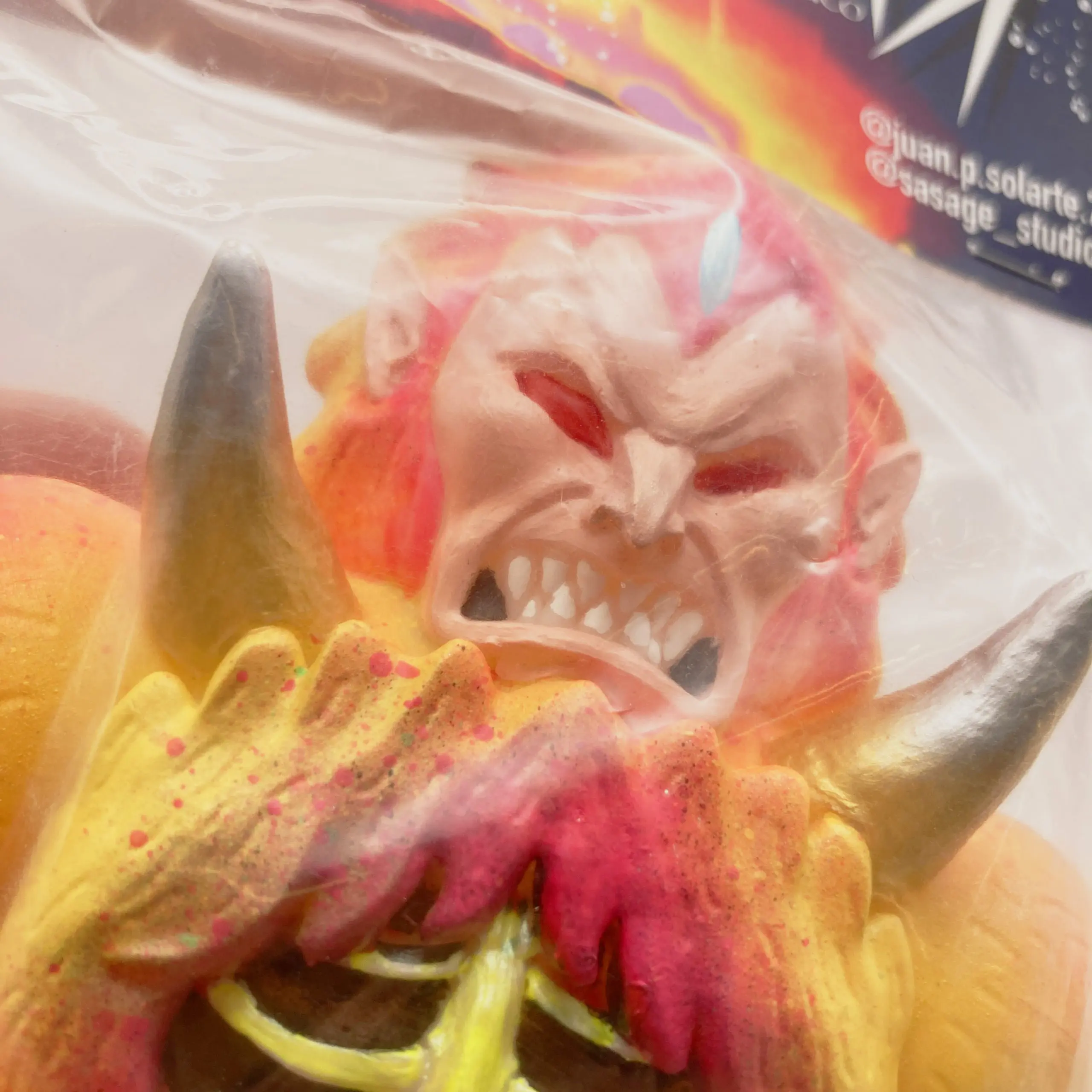Esta criatura demoníaca de aspecto monstruoso, luce una paleta vibrante de amarillos, rojos y verdes, destacando costillas fluorescentes y detalles pintados a mano que acentúan su fuerza salvaje.