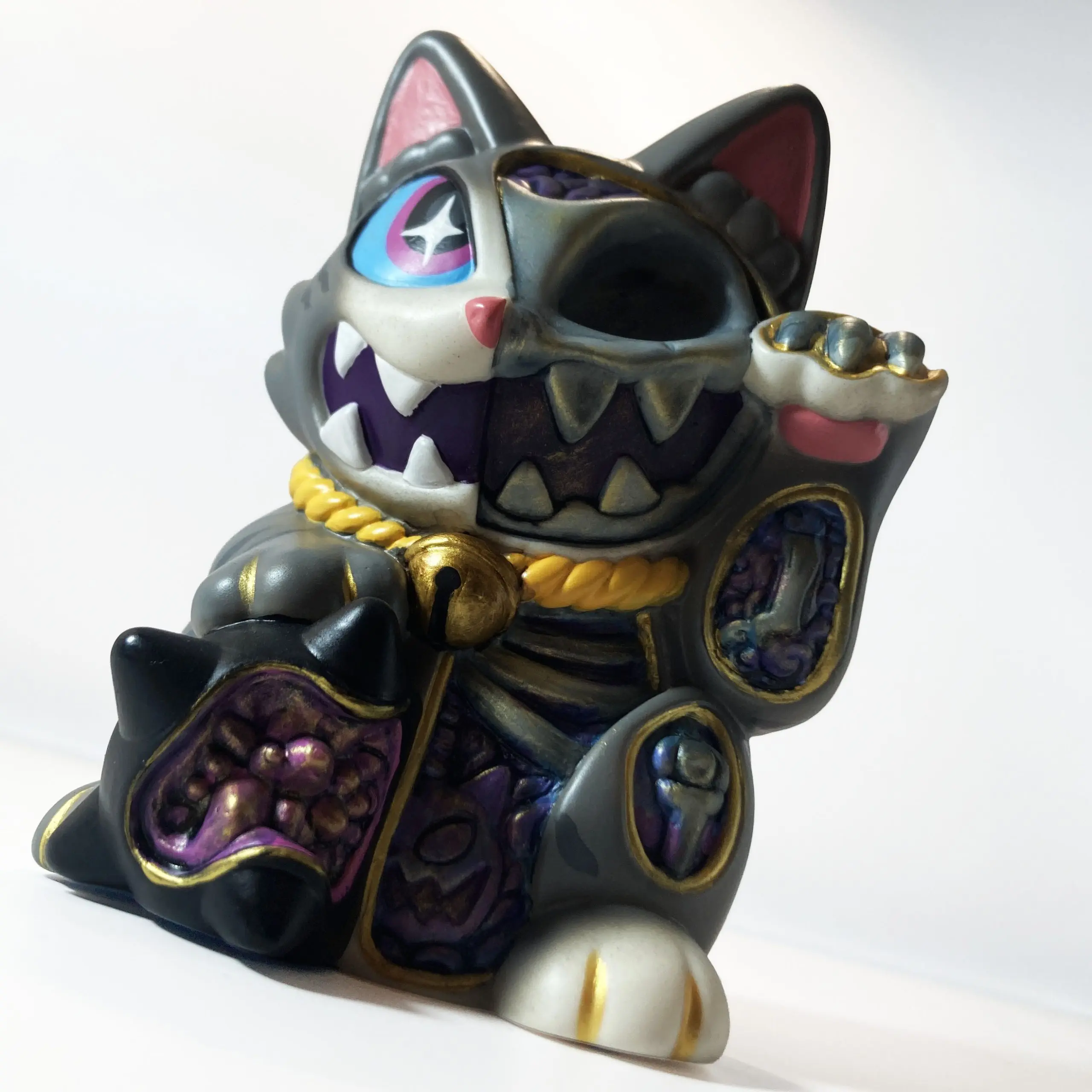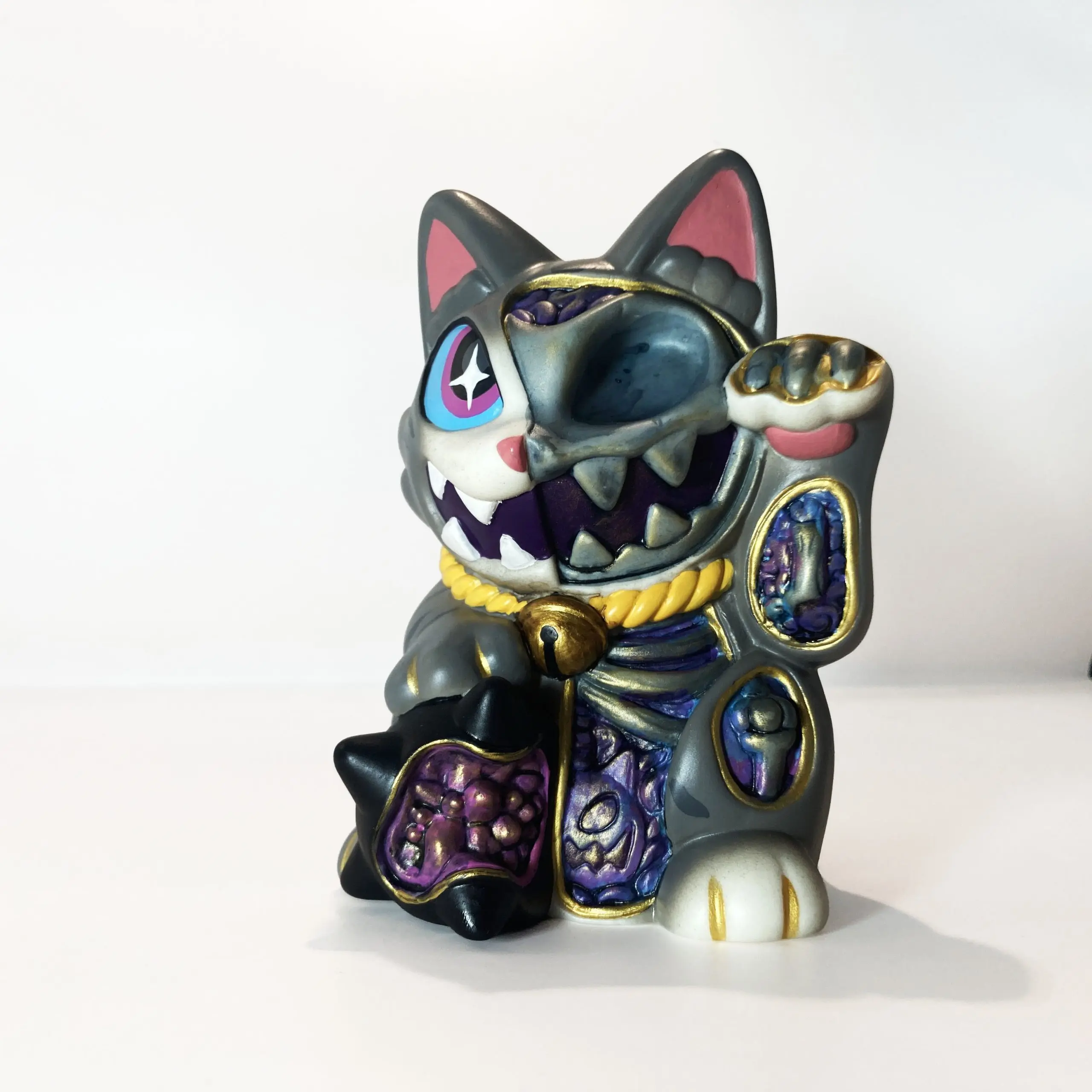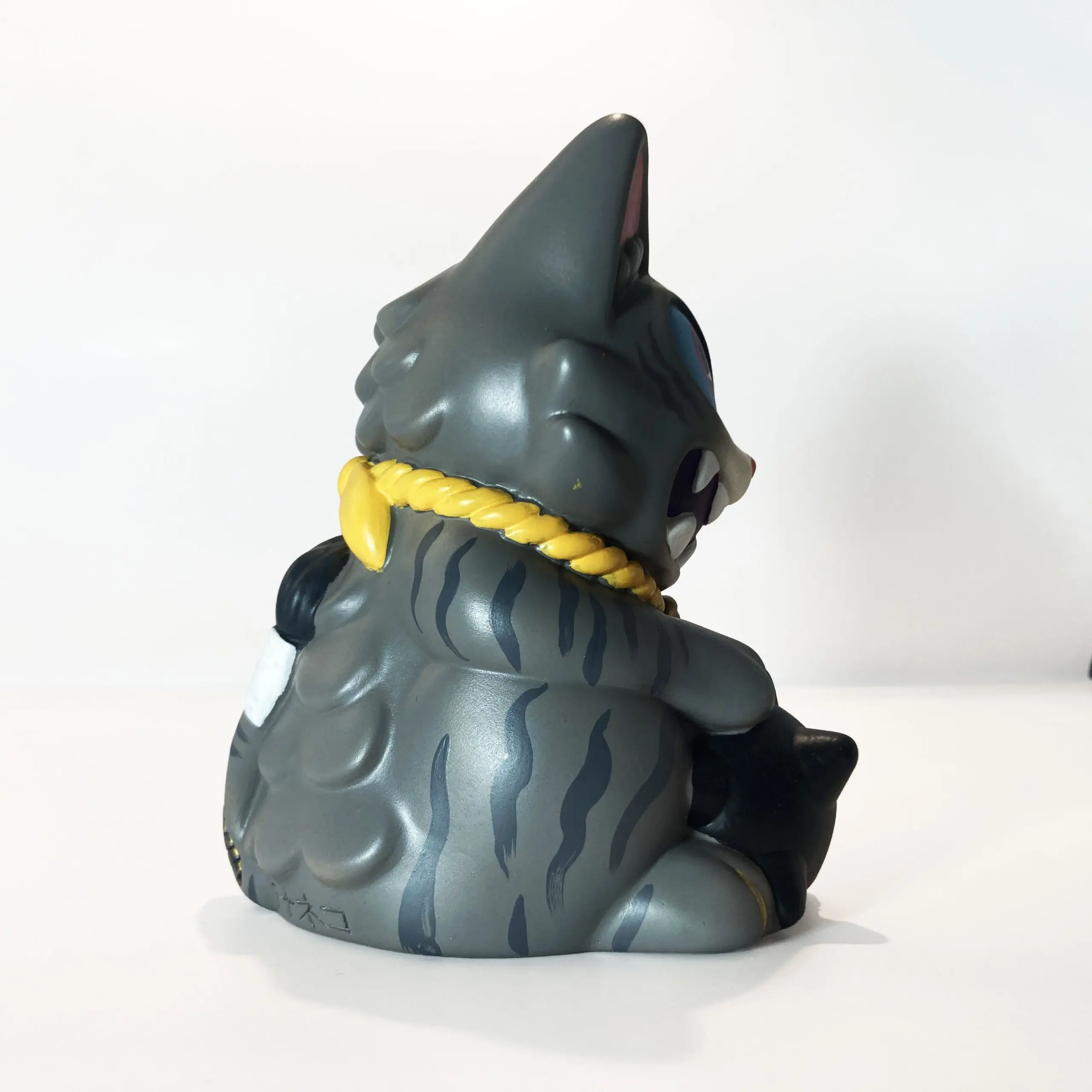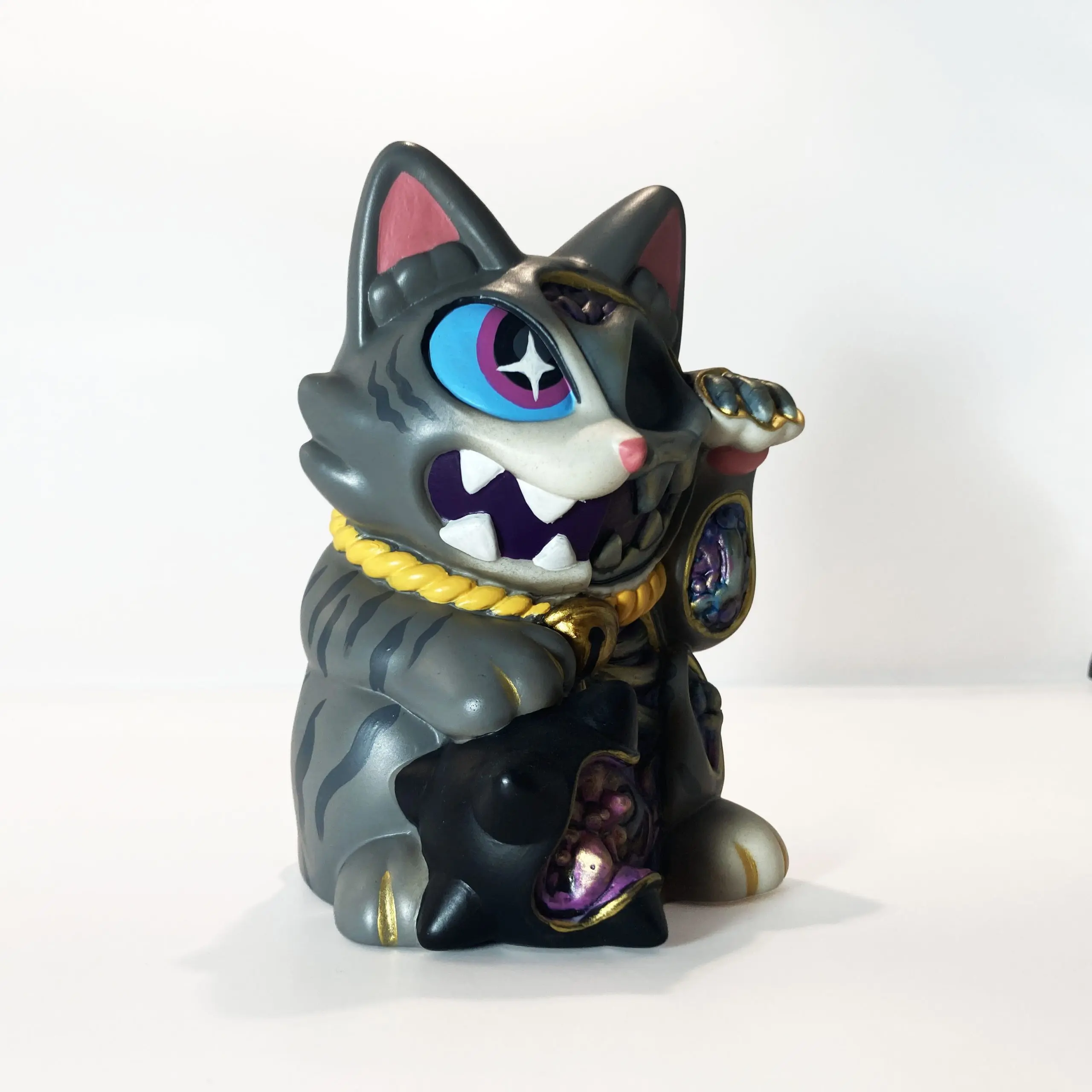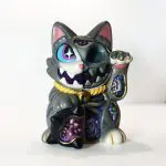 Con una silueta reconocible pero cargada de tensión, Maneki Wananeko se sitúa entre lo cultural y lo personal, reinterpretando un símbolo universal desde una mirada más oscura. El resultado es una pieza que mantiene la esencia del objeto original mientras lo transforma en un art toy con identidad propia y fuerte carga conceptual.