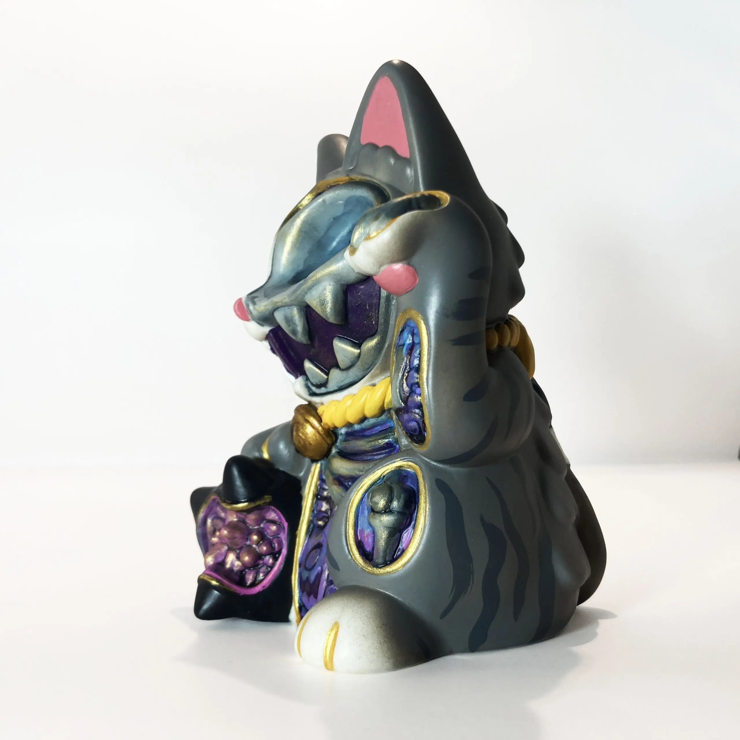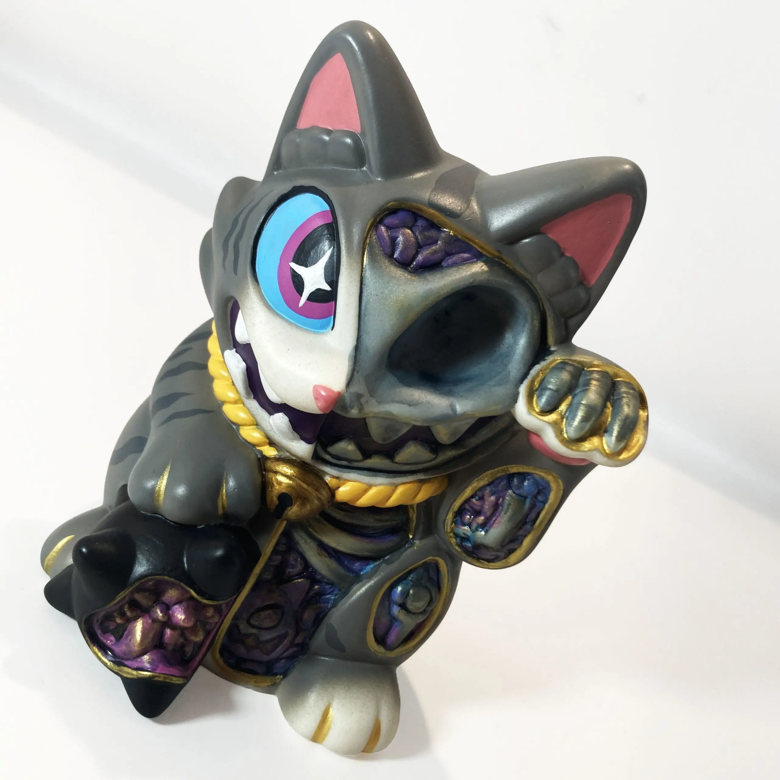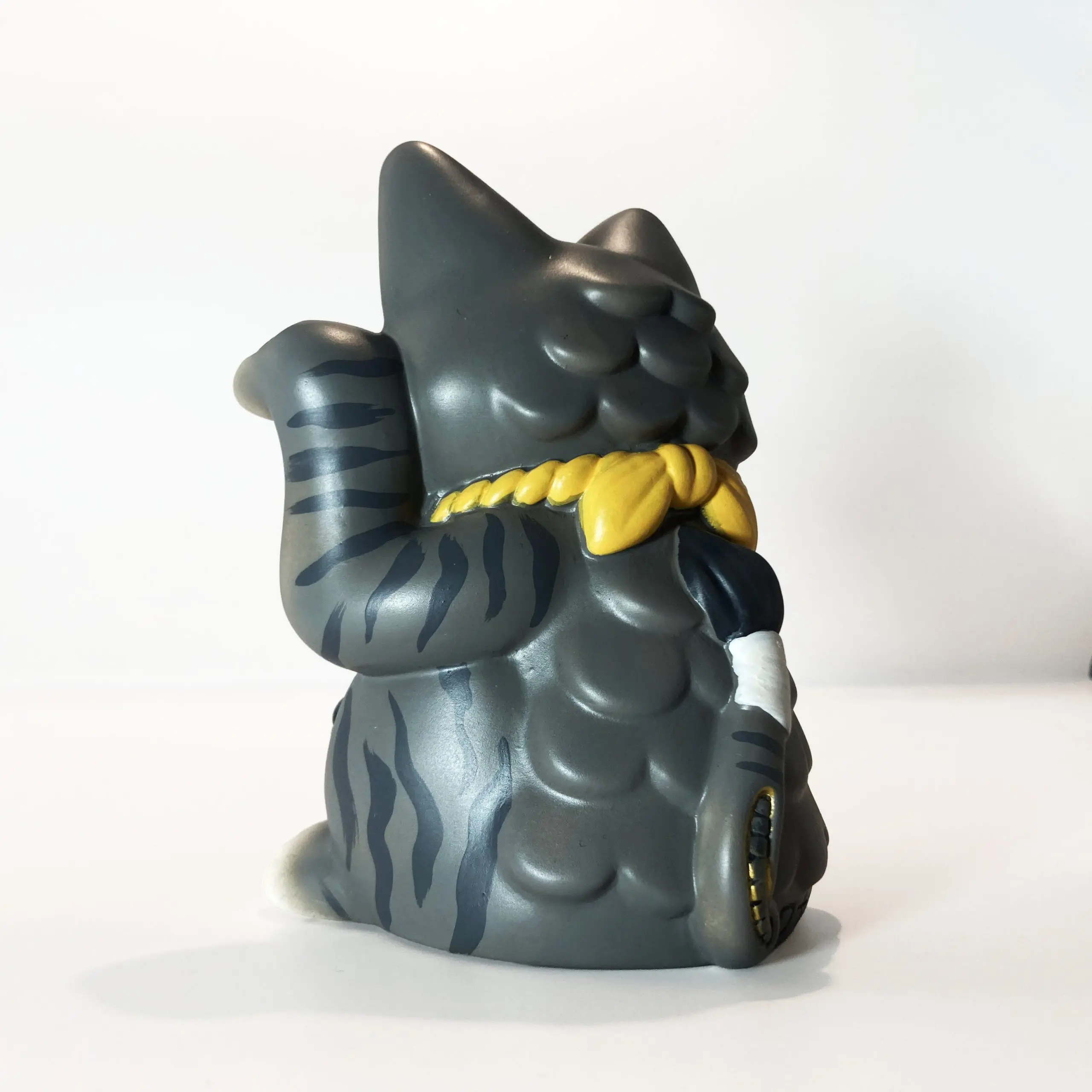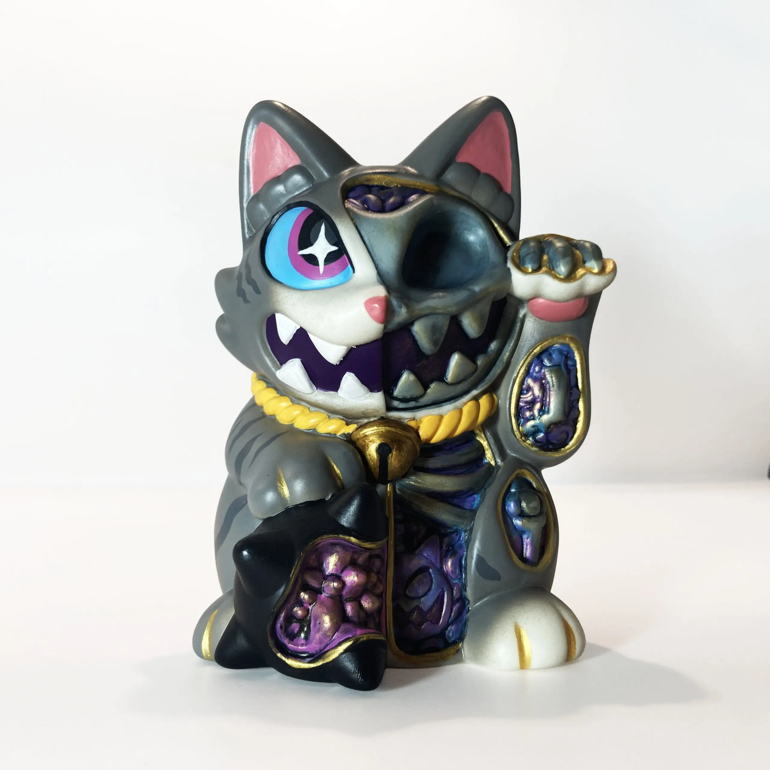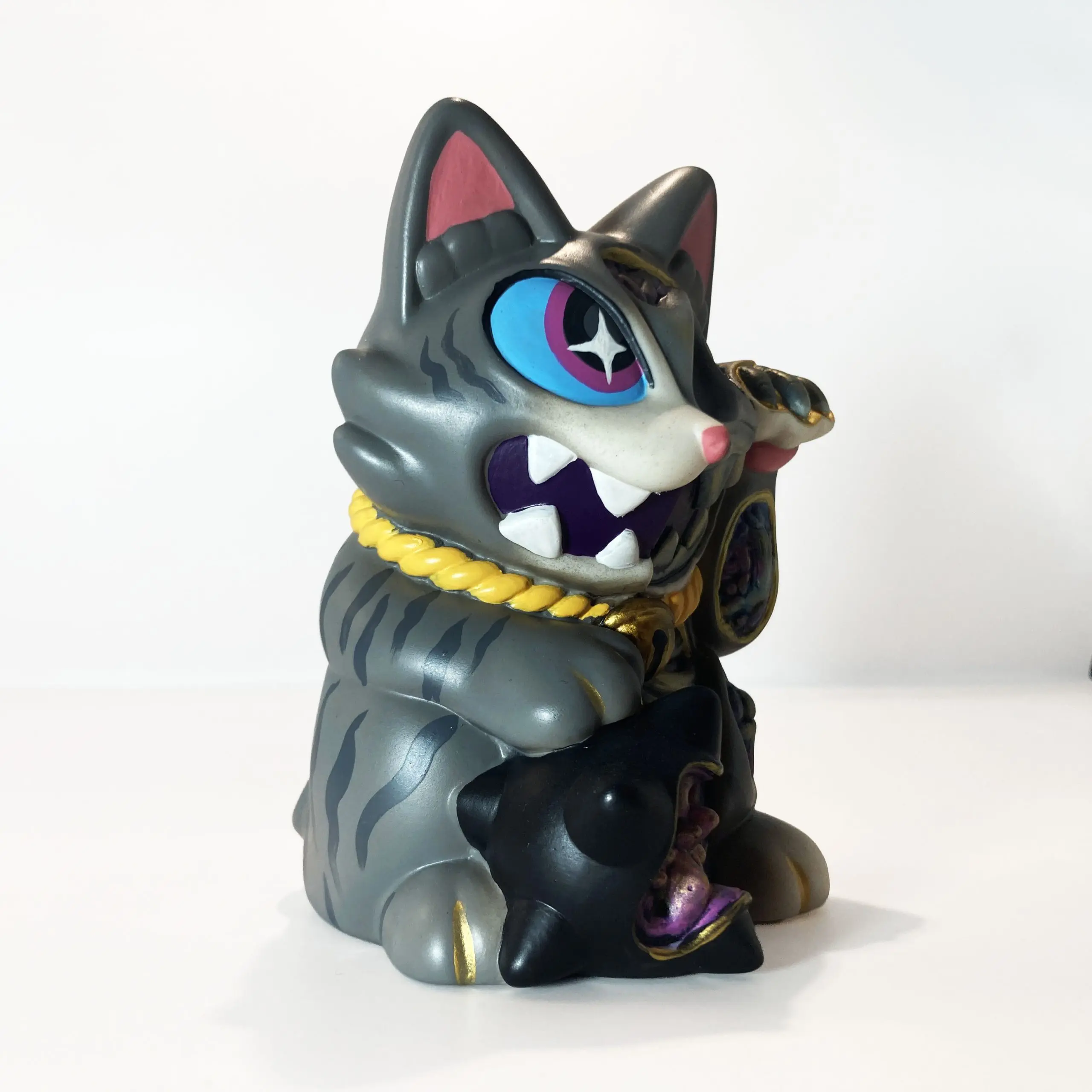 Con una silueta reconocible pero cargada de tensión, Maneki Wananeko se sitúa entre lo cultural y lo personal, reinterpretando un símbolo universal desde una mirada más oscura. El resultado es una pieza que mantiene la esencia del objeto original mientras lo transforma en un art toy con identidad propia y fuerte carga conceptual.
