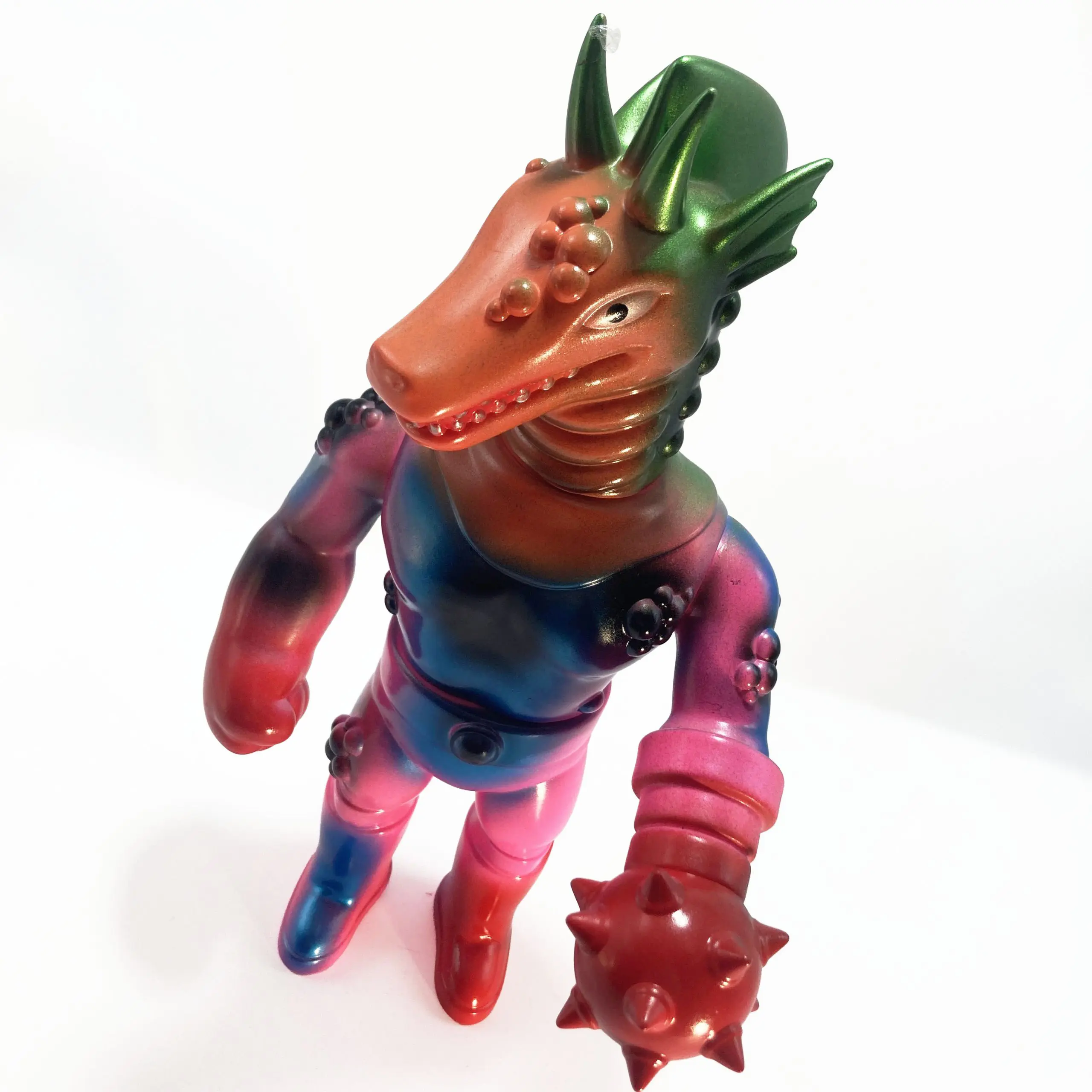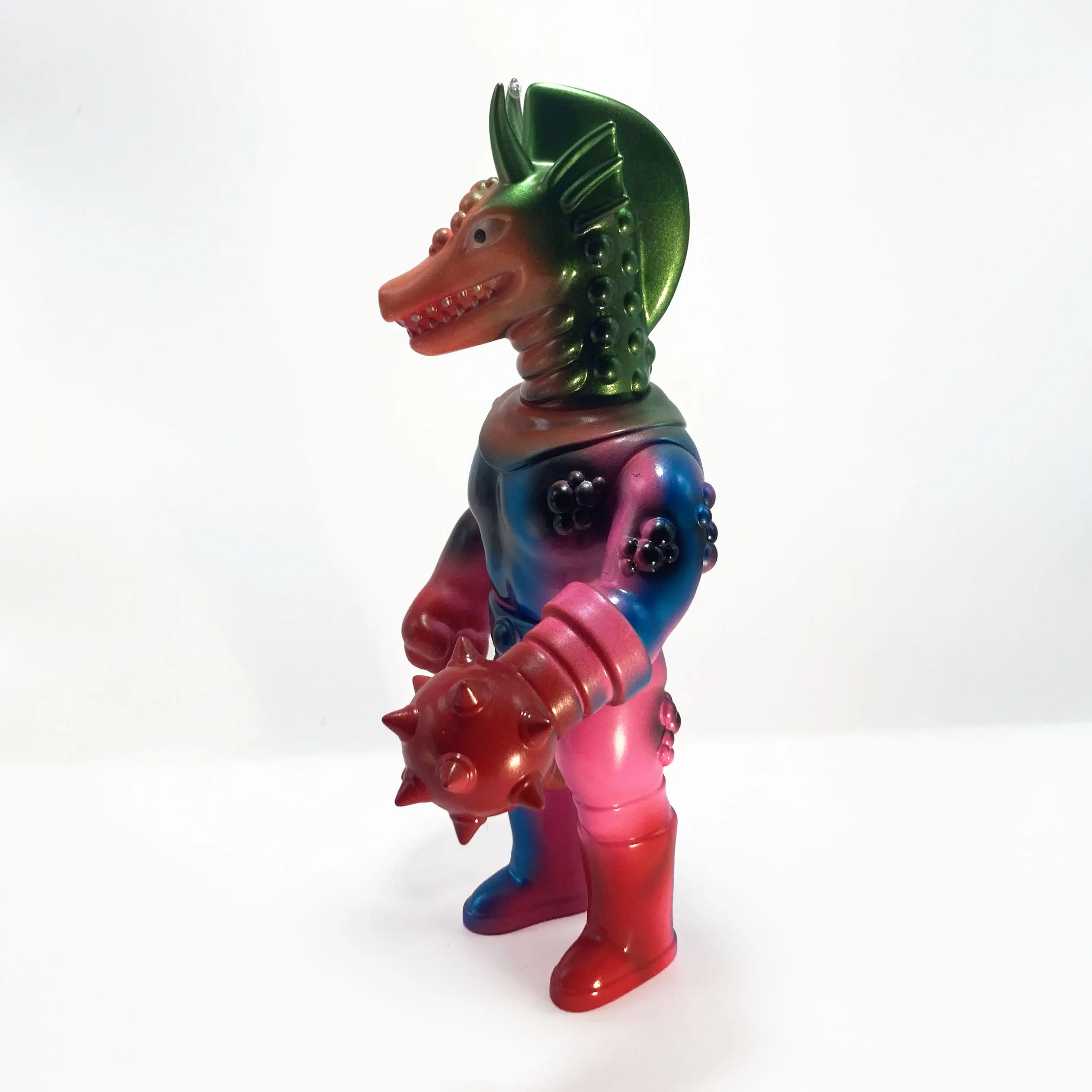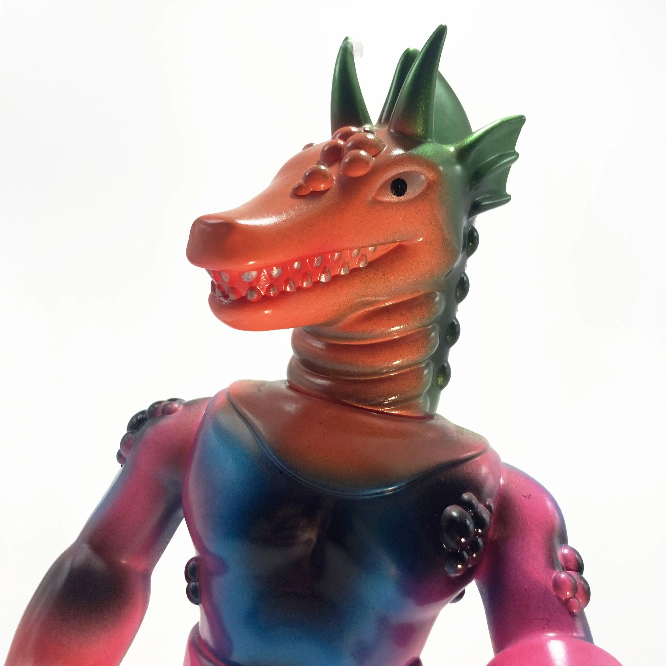 La pieza representa a un luchador que porta la máscara de Titanosaurus, no solo como un disfraz, sino como una identidad asumida, casi ritual. Su cuerpo, de formas simples y contundentes, remite a los juguetes vintage de vinilo blando, con volúmenes limpios y proporciones robustas, mientras que la cabeza concentra toda la intensidad visual: una silueta reconocible, dientes expuestos y rasgos que evocan directamente a los kaijus clásicos del cine japonés.