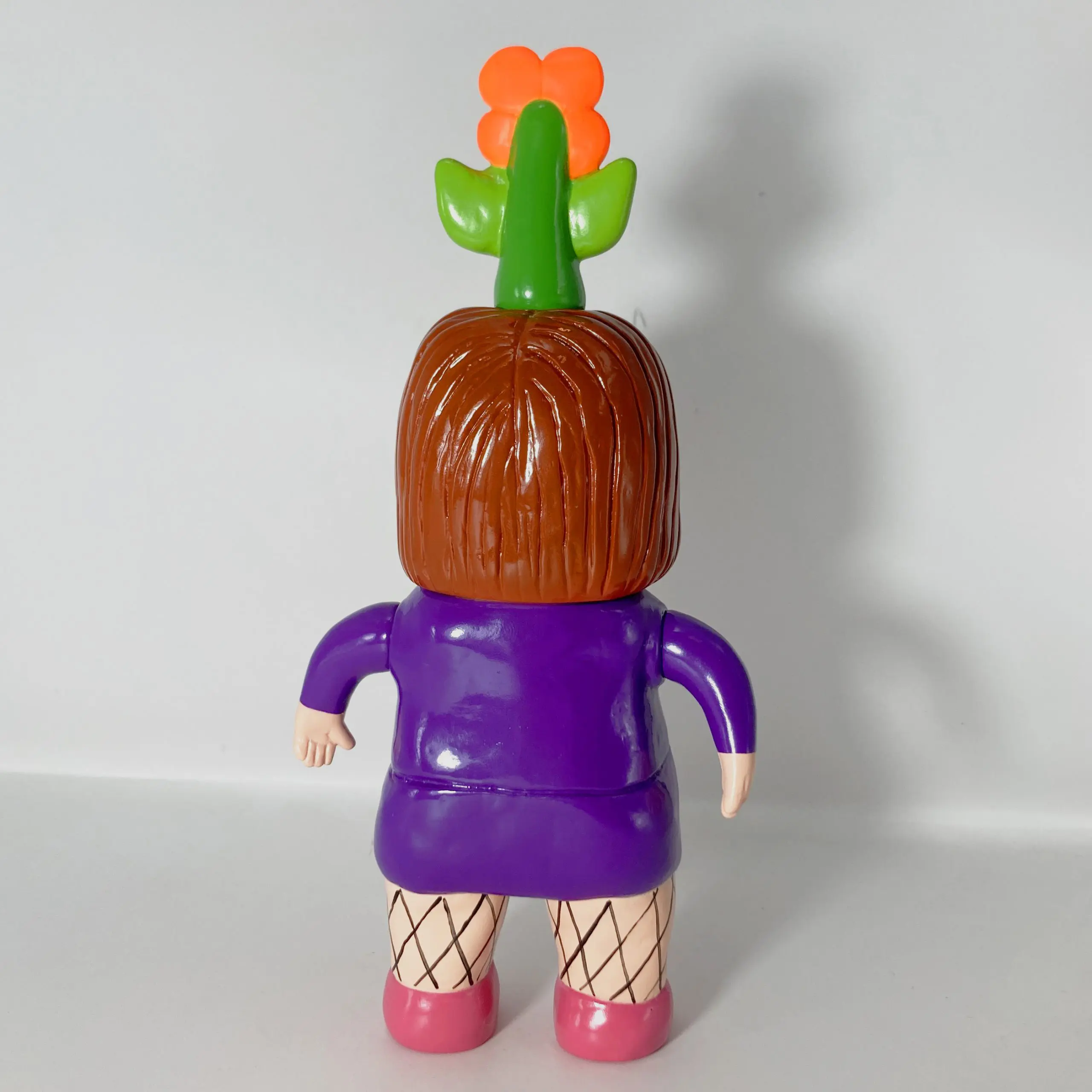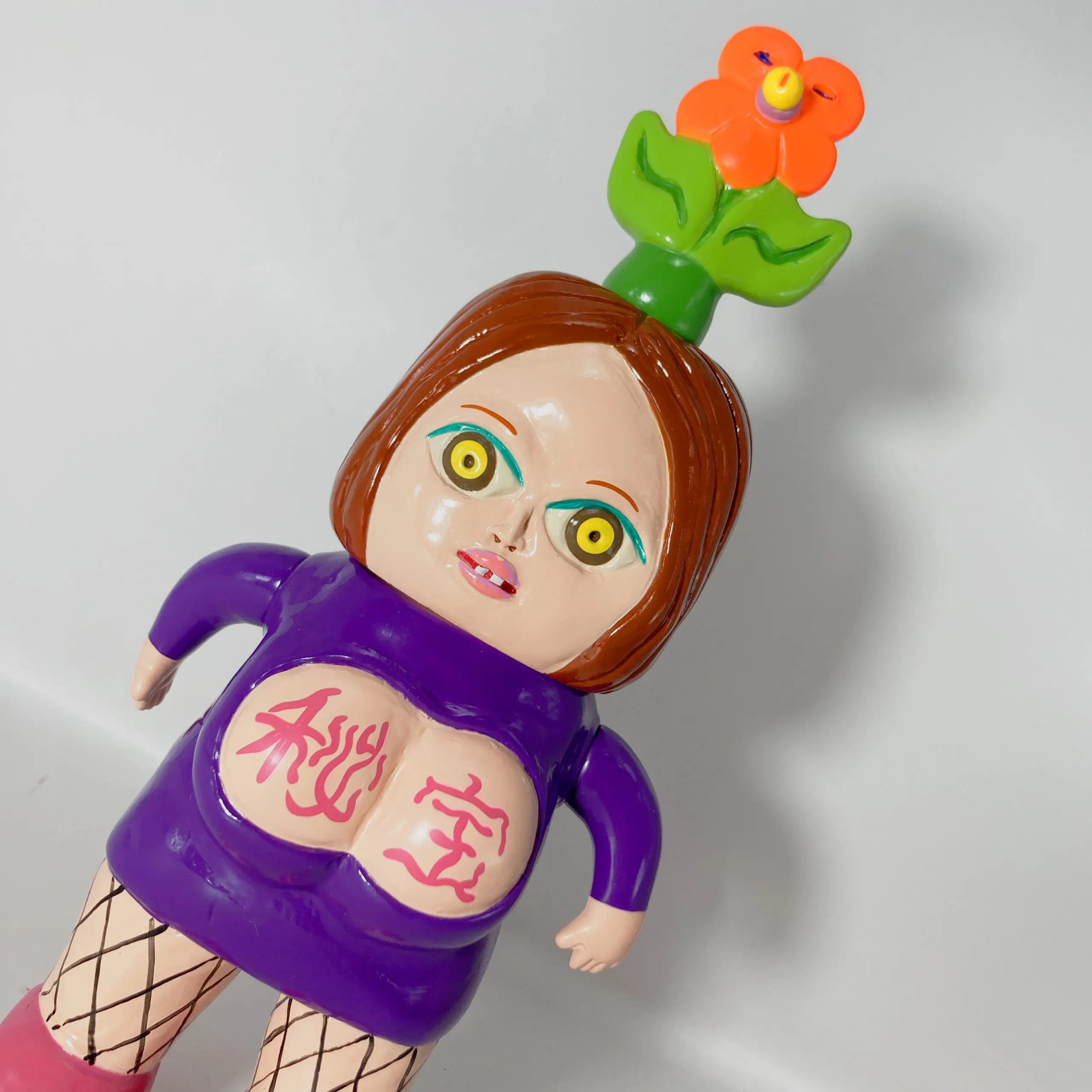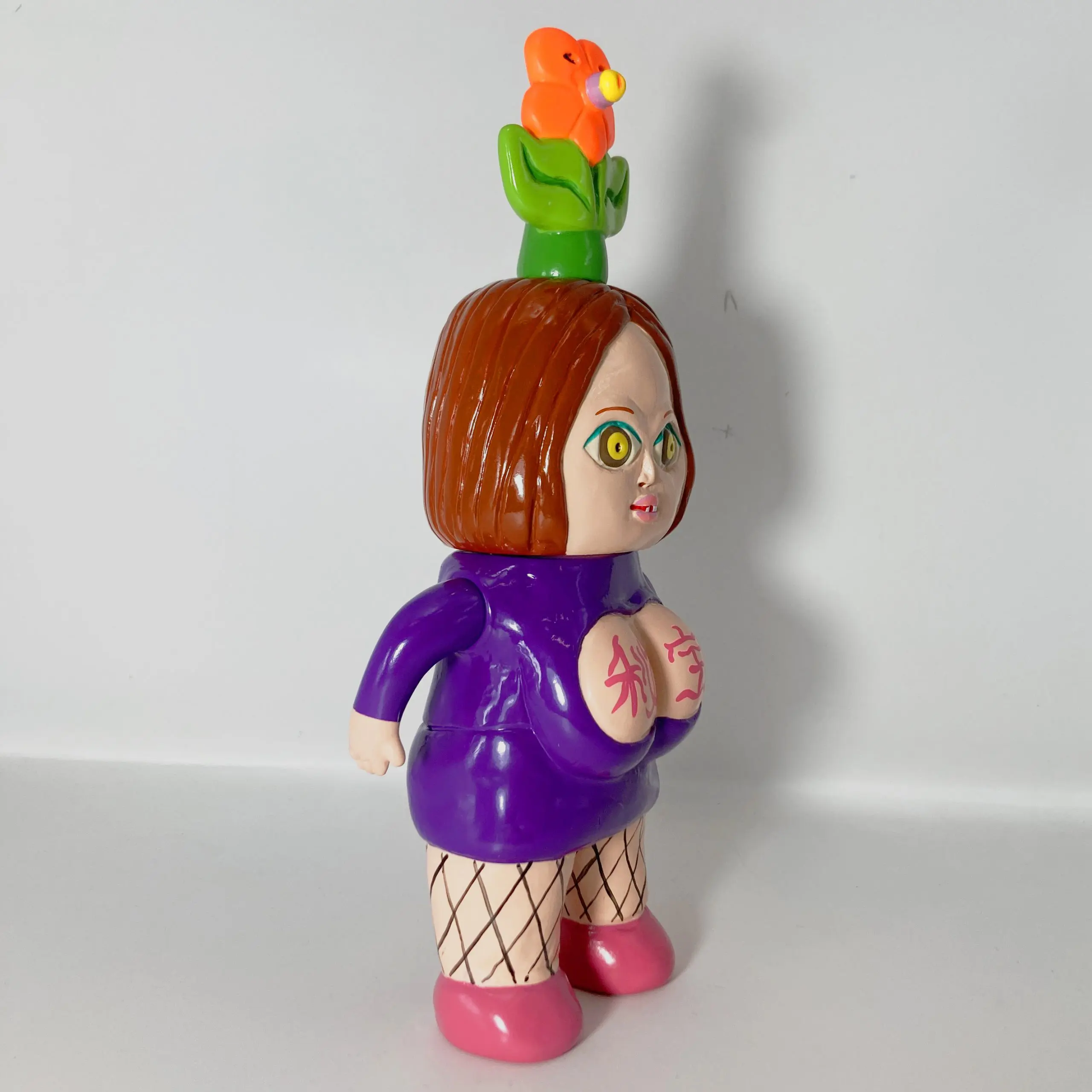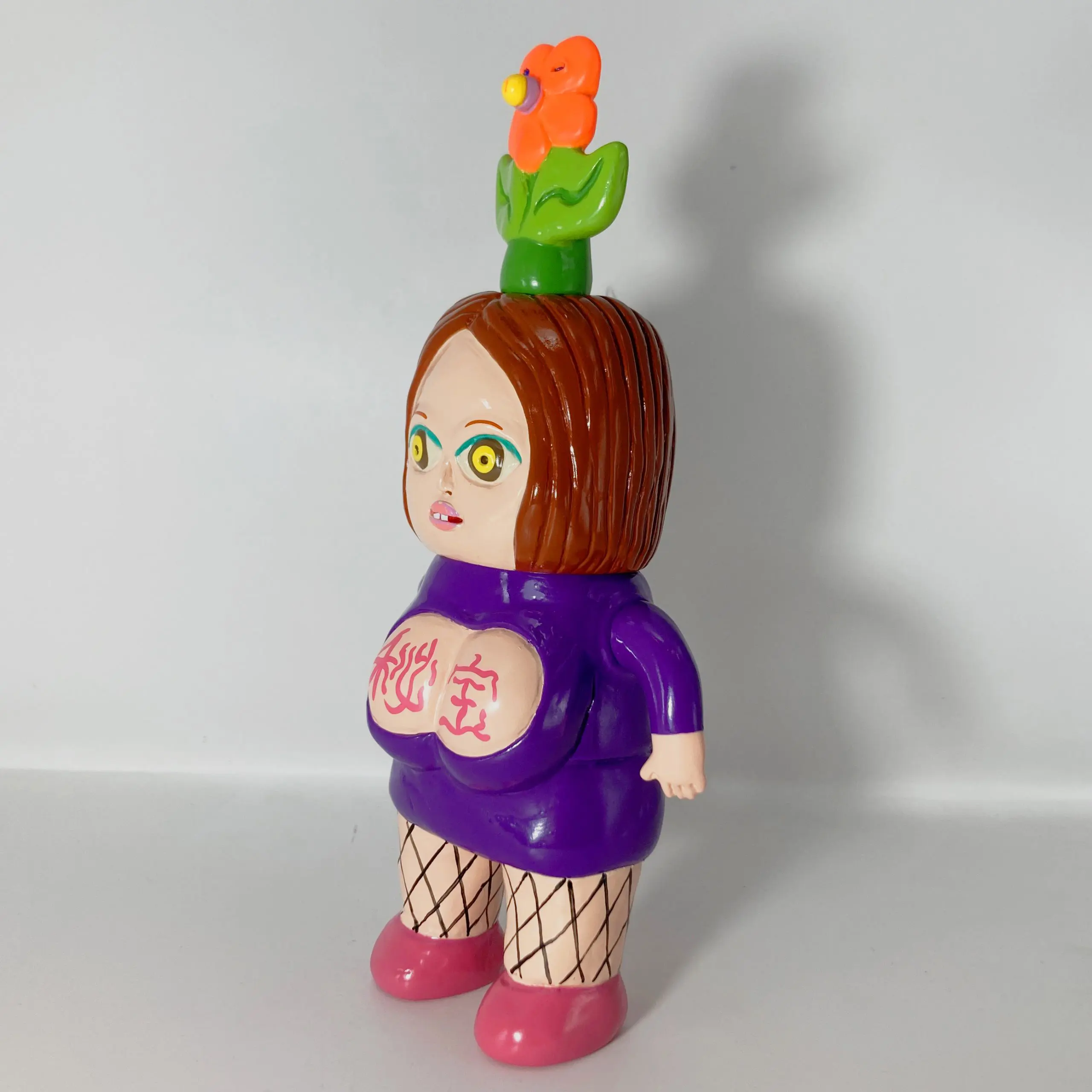 El material sofubi —suave, flexible, con ese tacto gomoso característico— invita al contacto físico, casi táctil, y resalta las articulaciones rudimentarias que permiten leves poses, aunque su verdadero poder reside en la estatua quieta: una presencia que parece contener un pulso interno, una tensión sexual perpetua que nunca se resuelve. Los colores varían según la edición —piel pálida o sonrosada, toques metálicos, versiones “oxidized” o en tonos vibrantes—, pero siempre mantienen esa paleta que evoca lo vintage, lo retro y lo prohibido.