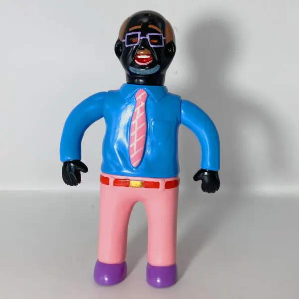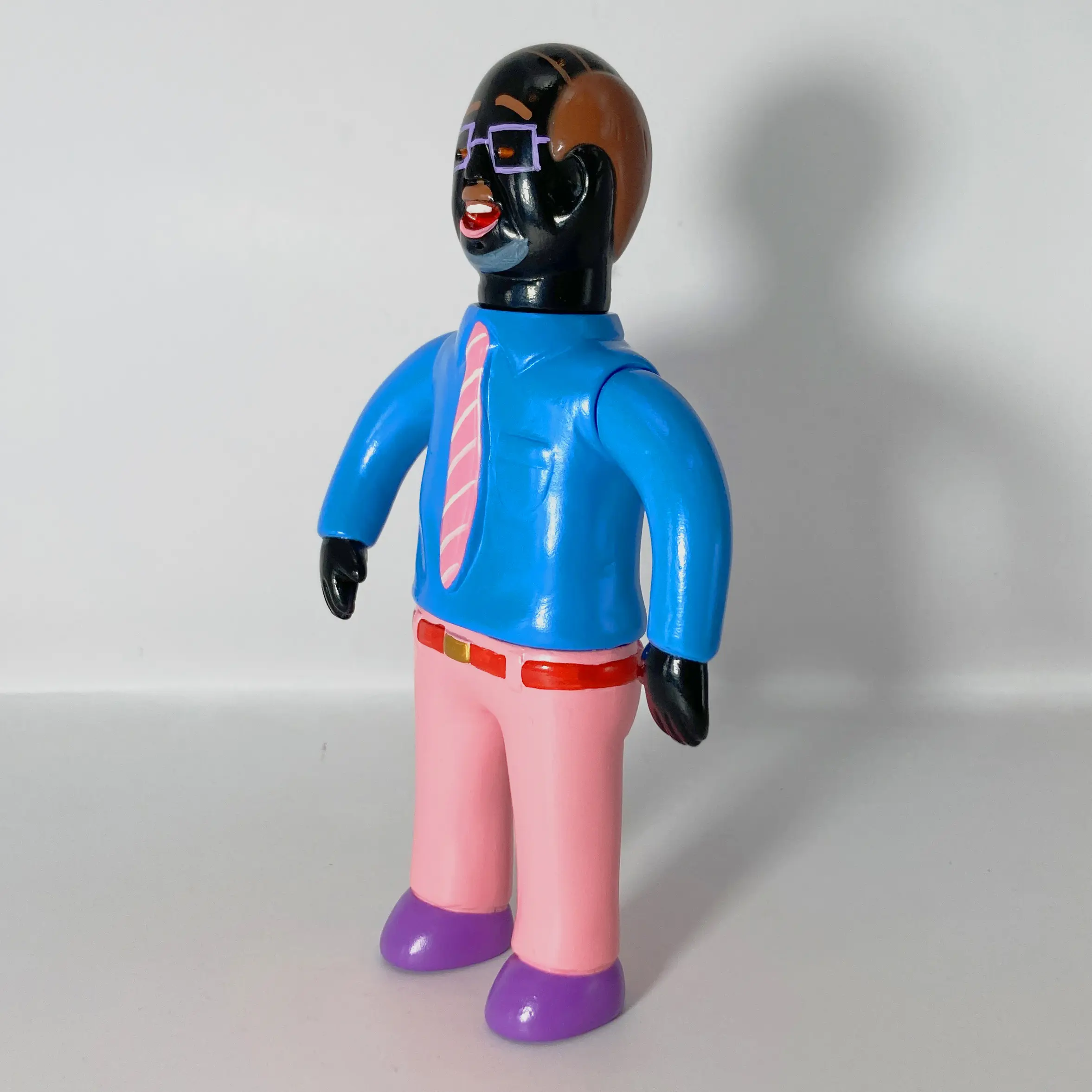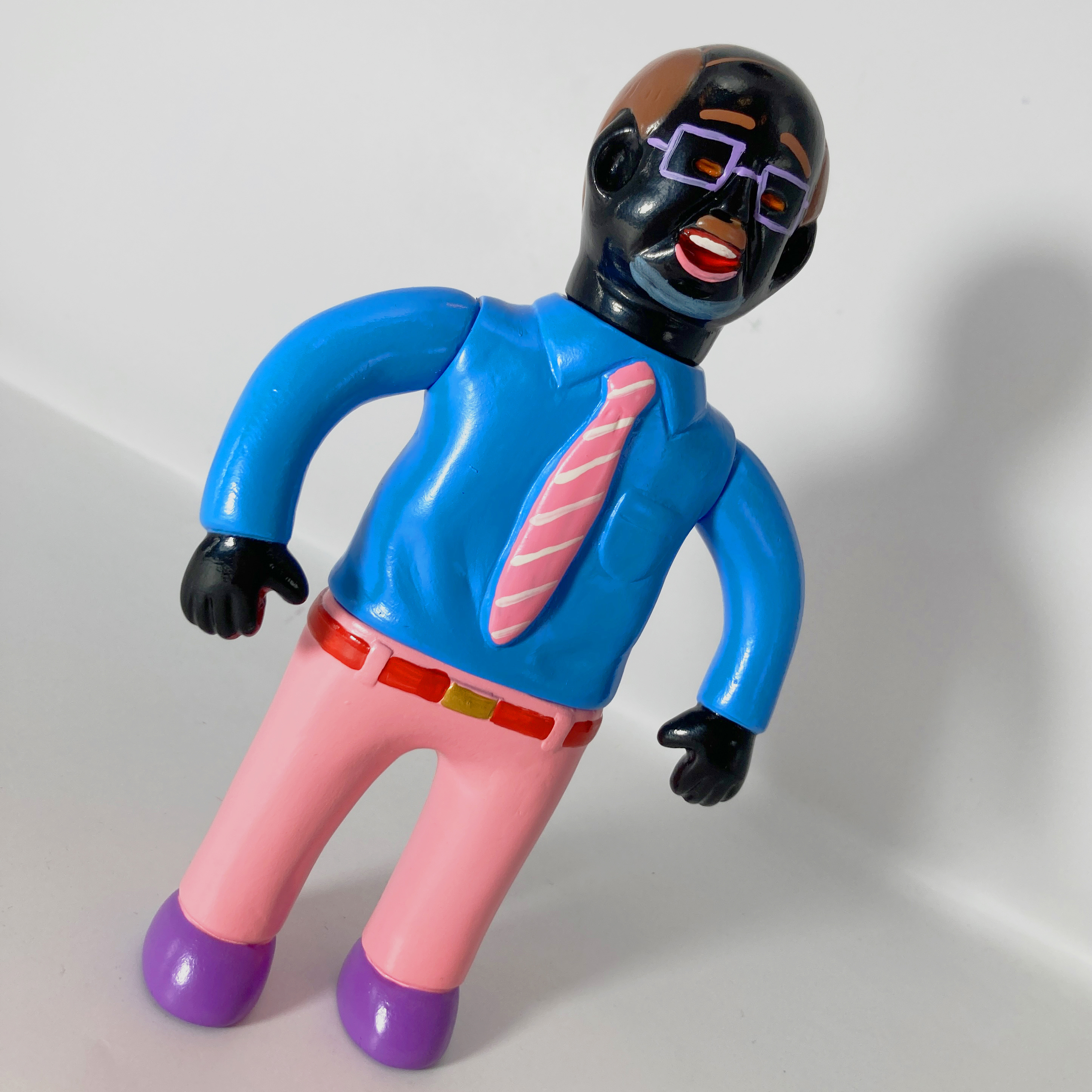 Producida principalmente en sofubi (soft vinyl), la figura mantiene esa ejecución deliberadamente simple y tosca: superficies planas, colores planos sin gradientes elaborados, detalles mínimos y una textura que evoca un prototipo o un boceto tridimensional. No busca realismo ni pulcritud; al contrario, la crudeza del material y la forma refuerza la sensación de algo incompleto, casi fallido, que refleja la propia percepción del artista sobre la vida del salaryman: una existencia repetitiva, despersonalizada y ligeramente absurda.