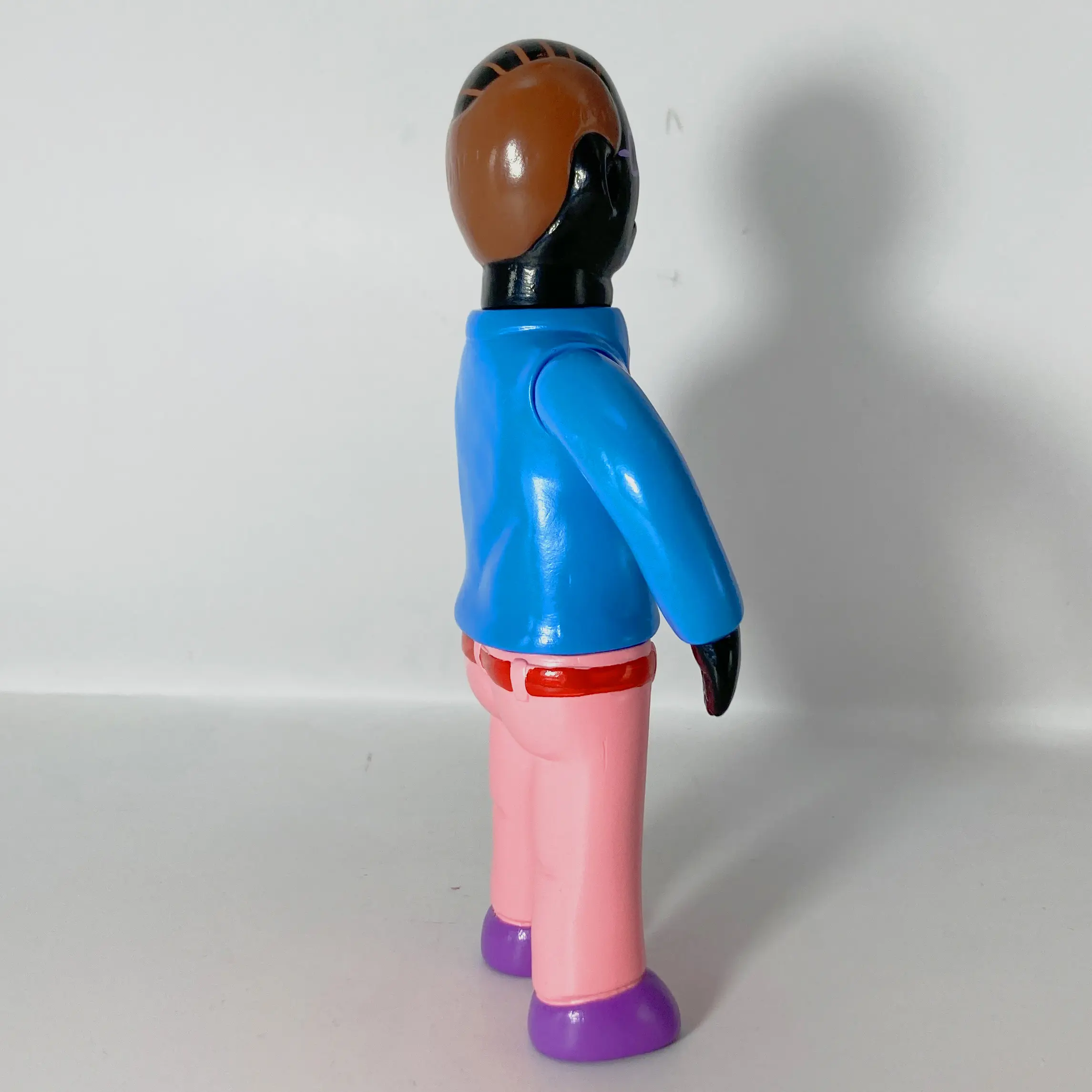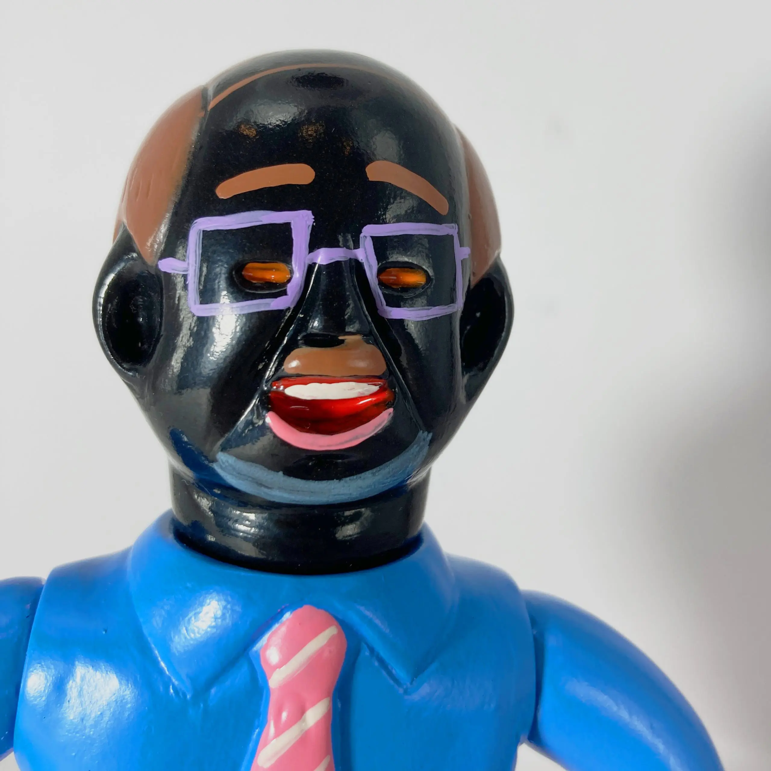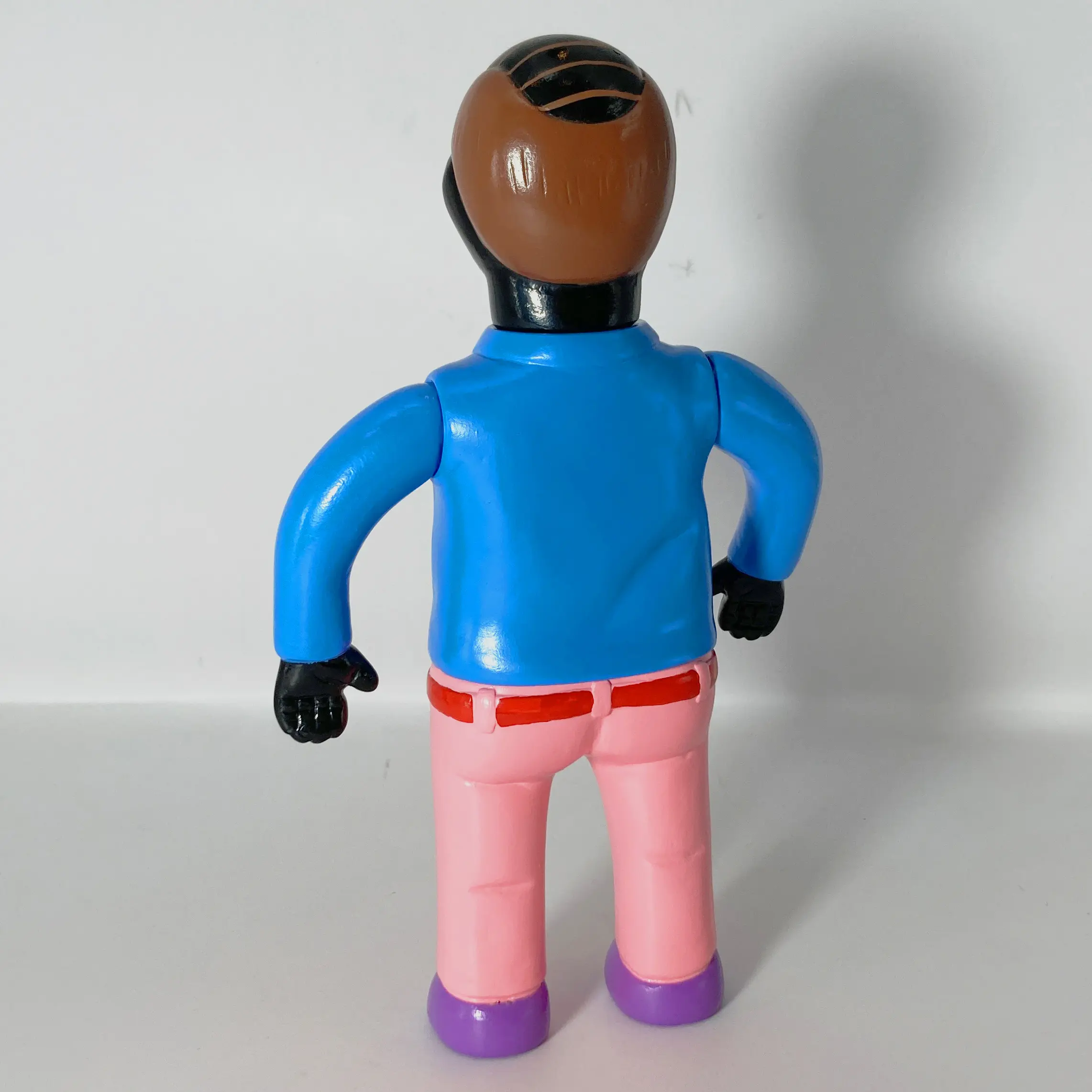 Producida principalmente en sofubi (soft vinyl), la figura mantiene esa ejecución deliberadamente simple y tosca: superficies planas, colores planos sin gradientes elaborados, detalles mínimos y una textura que evoca un prototipo o un boceto tridimensional. No busca realismo ni pulcritud; al contrario, la crudeza del material y la forma refuerza la sensación de algo incompleto, casi fallido, que refleja la propia percepción del artista sobre la vida del salaryman: una existencia repetitiva, despersonalizada y ligeramente absurda.